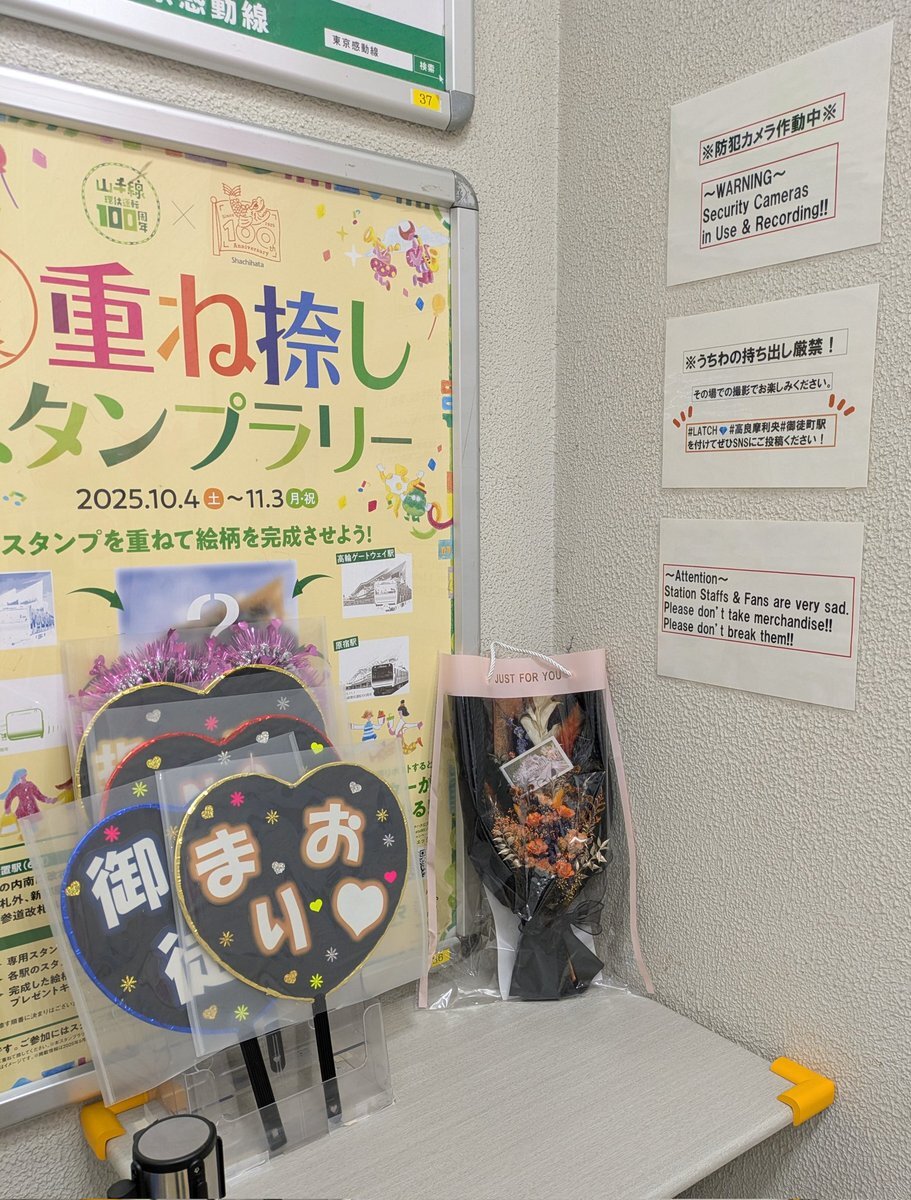 パッセンジャーのみなさん、申し訳ございません… あれだけ注意書きをしたにも関わらず、応援うちわを一部盗まれましたので、当面の間うちわは撤去させていただきます🙇 #LATCH💎 #高良摩利央 #御徒町駅 pic.x.com/T0TQ2QhKls