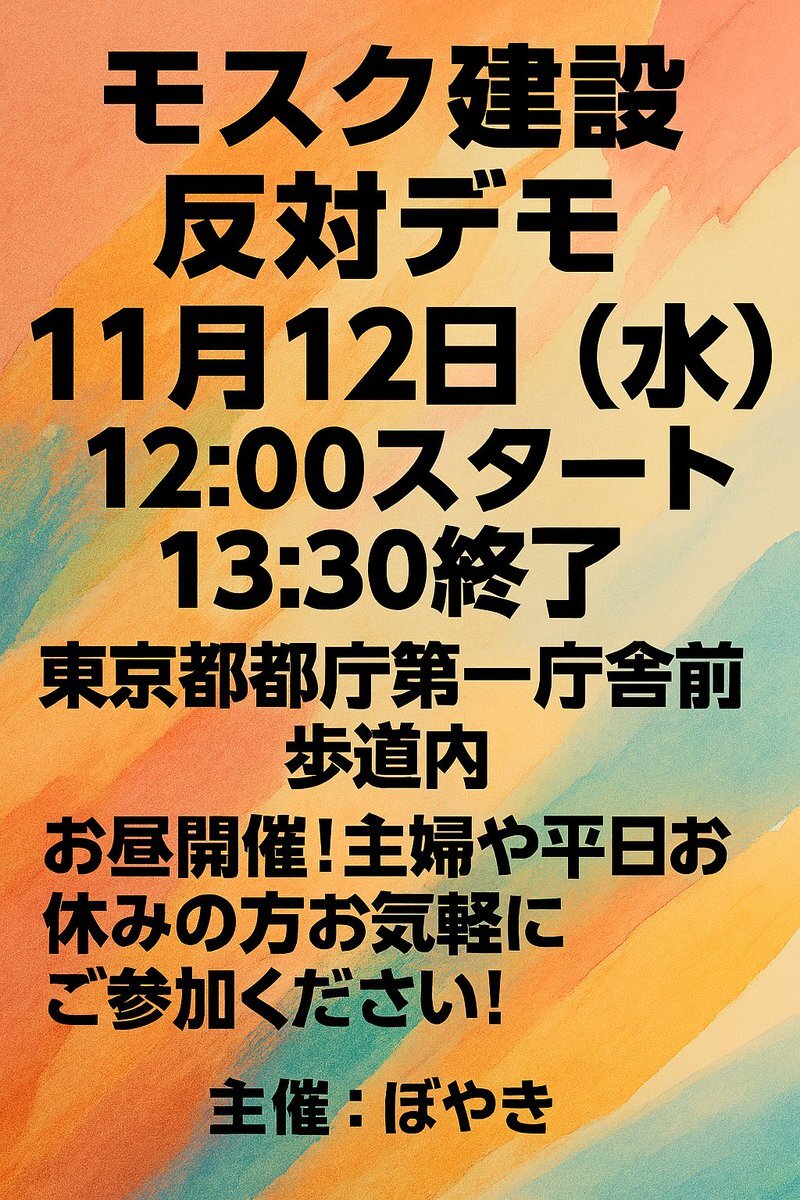 ぼやきです‼️ 📣都庁前デモ速報‼️ 【モスク建設反対デモ】 お昼開催なので主婦や平日休みの方も参加OK⭕️‼️ 11/12(水) 12:00〜13:30モスク建設反対デモで緊急開催します‼️ 場所:東京都庁第一庁舎前歩道内 #モスク建設反対 #モスク建設反対デモ #小池百合子 #移民政策反対 #土葬反対 #御徒町モスク