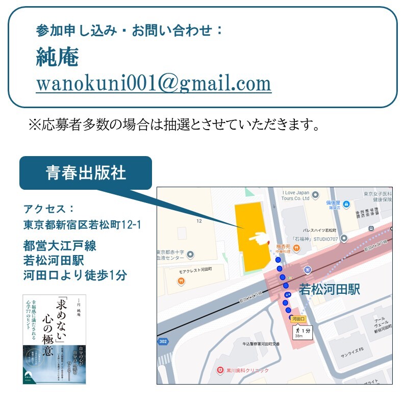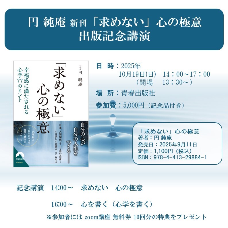 \📣出版記念講演📚/ 10月19日(日)14:00~ 『「求めない」心の極意』の著者 #円純庵 先生の出版記念講演会が、東京・新宿 青春出版社 内で開催されます。 お申込みお待ちしております!😊 #心学 #人生 ▼講演会詳細・お申込みは画像をご覧ください pic.x.com/uSWNyFkc8E