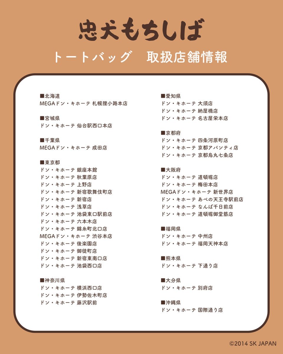 ドン・キホーテ限定 #忠犬もちしば トートバッグ 導入店舗一覧は画像をご覧ください。 ※ドン・キホーテ系列一部店舗でお取扱いしております。 pic.x.com/6nsNieXS76