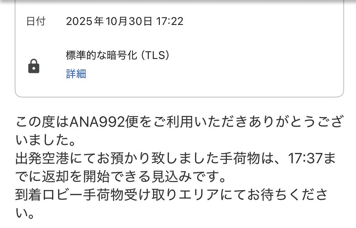 到着ゲートは50番です。この機内アナウンスを聞いて「げっ、サテライトやん」と嘆いた。その後、荷物返すの15分後と、ANAからのメール。手荷物受取所に着いたら、ターンテーブルが回り出したタイミング。遠いなぁ。 #ANA #サテライト #ストレスフリー #快適性 #利便性 pic.x.com/K6OzntHSex