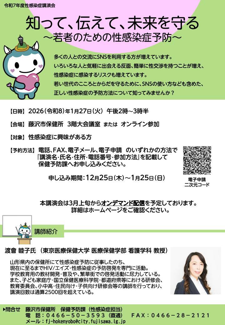 令和7年度藤沢市性感染症講演会 「知って、伝えて、未来を守る~若者のための性感染症予防~」 日時:1月27日(火)午後2時から3時30分 開催形式:会場での講演(Zoom配信も予定) 予約:事前予約制 詳しくは藤沢市ホームページをご覧ください。 保健予防課:℡(50)3593 FAX (28)2121 #性感染症 pic.x.com/CvXCFXD9G4