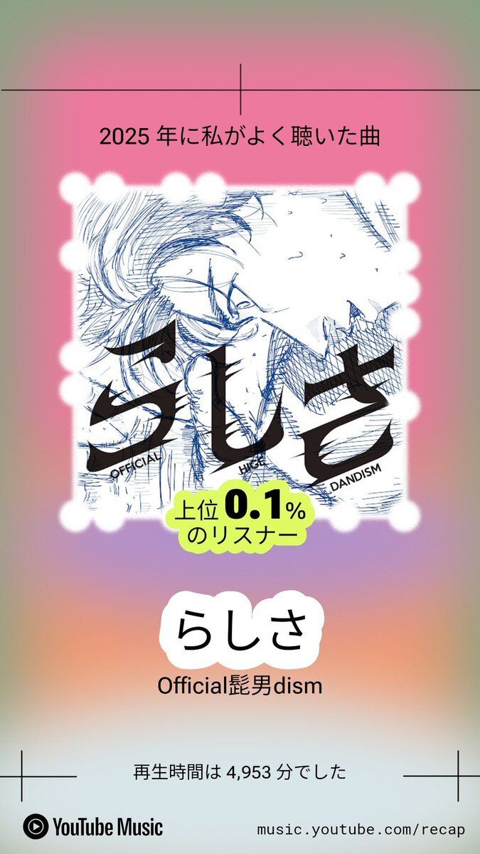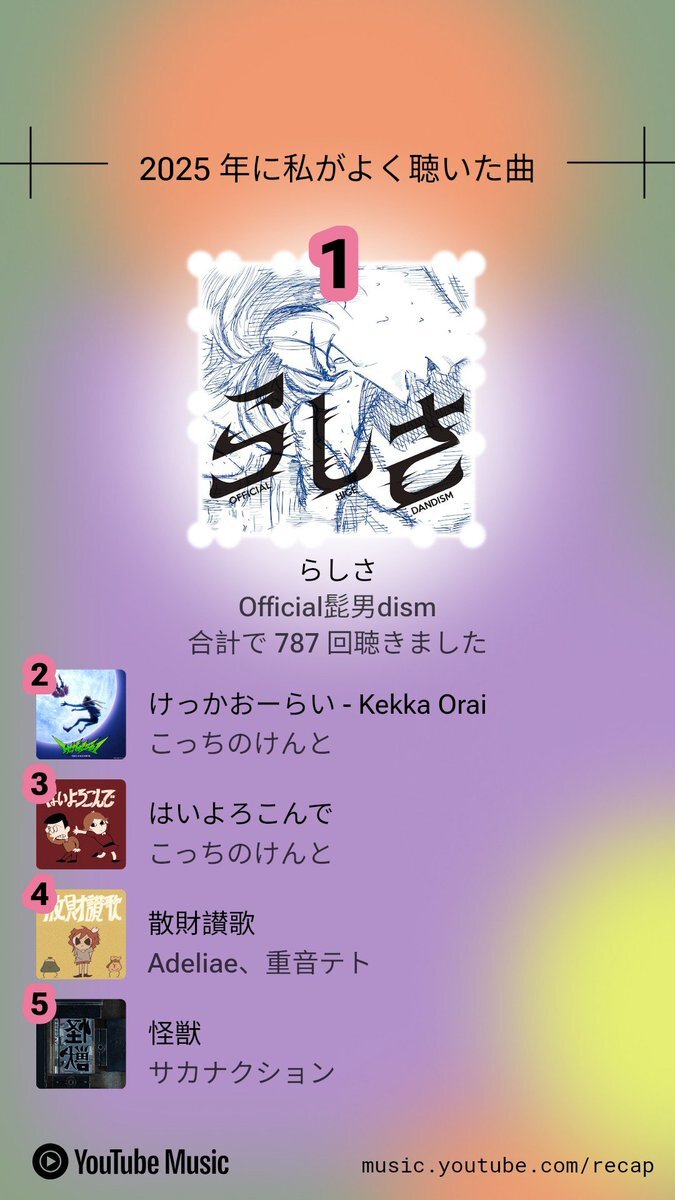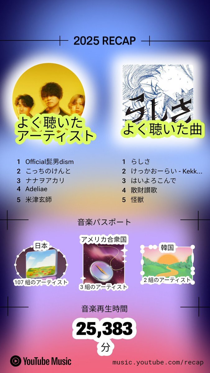 2025年 #YouTubeMusic で 自分がよく聴いた曲ランキング🧏♂️🎧 ① #らしさ / Official髭男dism ② #けっかおーらい / こっちのけんと ③ #はいよろこんで / こっちのけんと ④ #散財讃歌 / Adeliae、重音テト ⑤ #怪獣 / サカナクション 今年の音楽再生時間は 25,383分。 @officialhige pic.x.com/2PIM5qF0mG