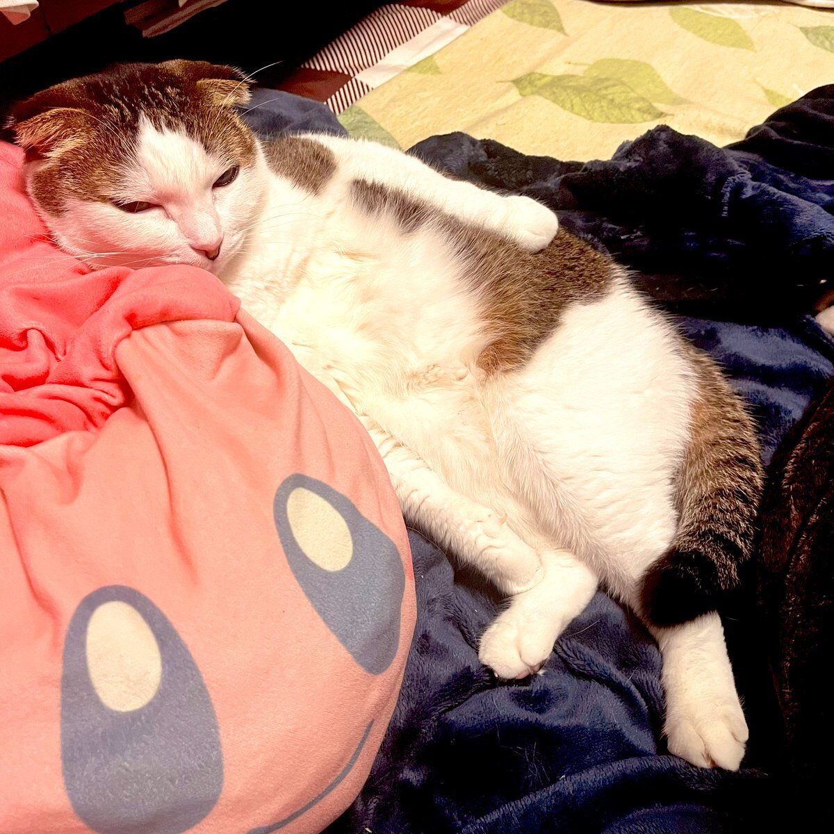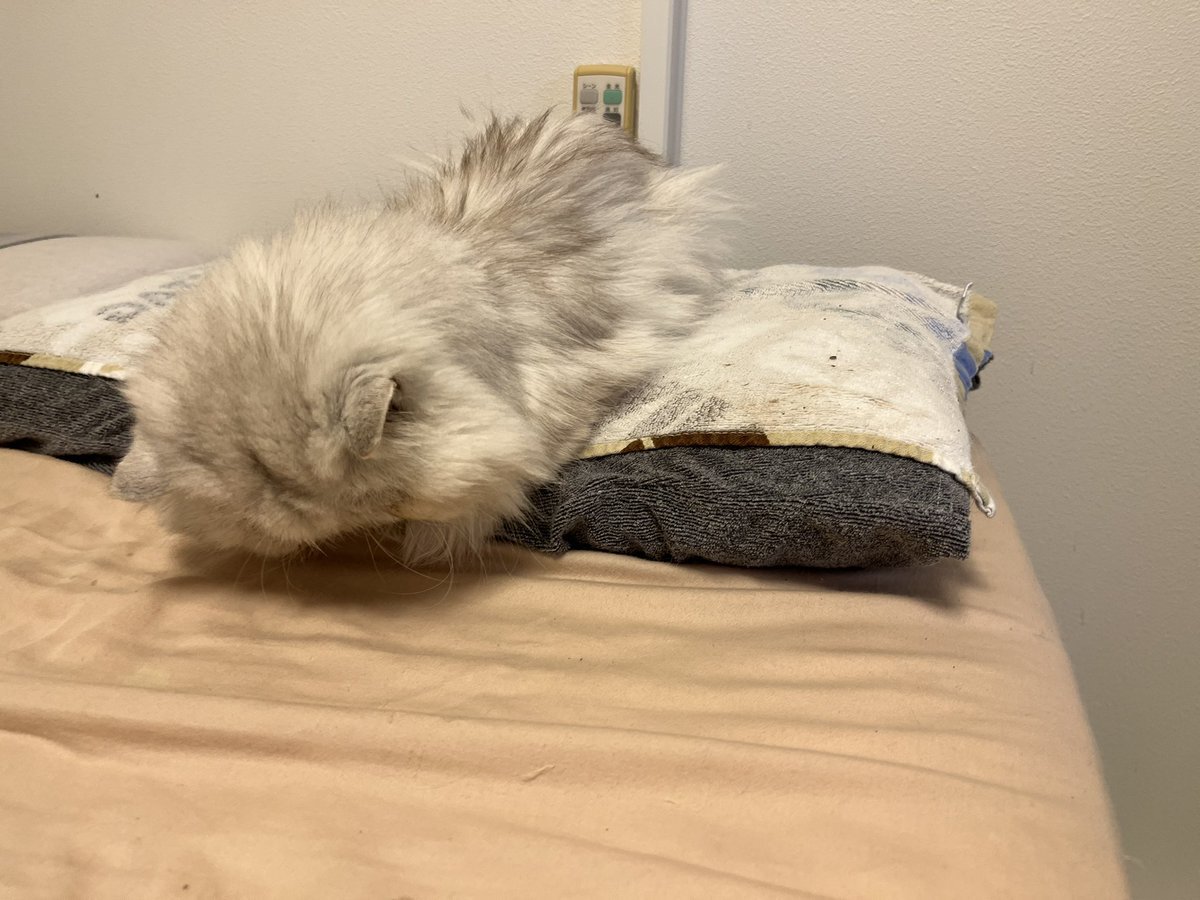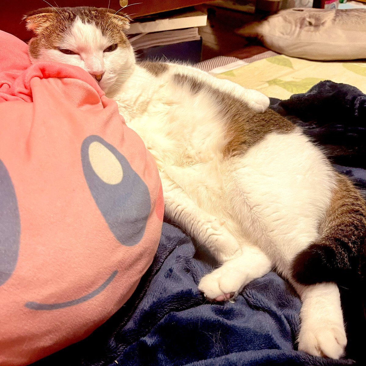 診断されて269日目 おNewの毛布で抱き枕と枕の間で寝るおくう様 カリカリの方を割と食べていたみたいでパウチの方を半分〜半分ちょいほど残してました ま、空腹になったら食べるんだけどね #慢性腎不全 pic.x.com/SCbXI0SD4l