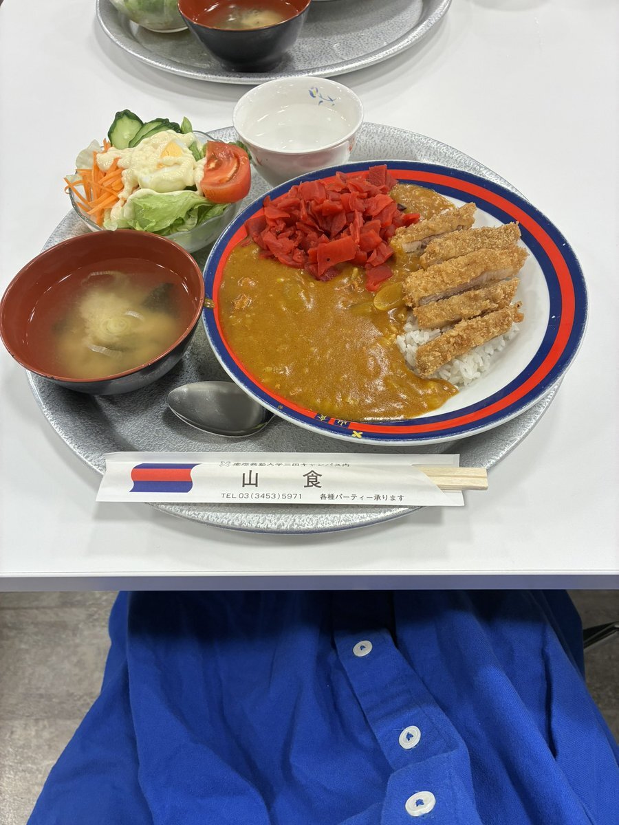 お昼に慶應大学の山食カツカレーを食べました。 学生さんたちが福神漬を山盛りにしていたので、つられて私も。 昔ながらの黄色いカレーですが、見た目に反してスパイシーでした😋 #1型糖尿病 #慶應大学 #山食カレー pic.x.com/SgqgKmaSfg