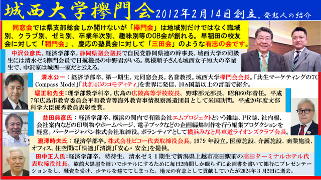 【城西大学欅門会2012年2月14日創立】 今年は12月5日(金)に池袋「蔵之介」で総会と懇親会を行います。総会は直ぐに終わりますので懇親会を目指して参加してください。(連絡先:益田典彦、小川雅弘) #城西大学 #早稲田大学 #慶應大学 #小泉進次郎 #山口すすむ #水森かおり #辰巳ゆうと #電通 pic.x.com/PpfAZ62viW
