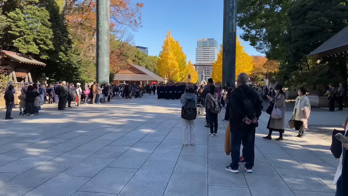 【防衛大学生の靖国行進】 若き防大生が徹夜で横須賀から 九段まで徒歩で行進! 拝殿で参拝をする。 陸海空三軍の士官候補生たちの 隊列乱れない行進に感動した🥲 偶然居合わせた参拝者たちは 拍手で迎えている👏