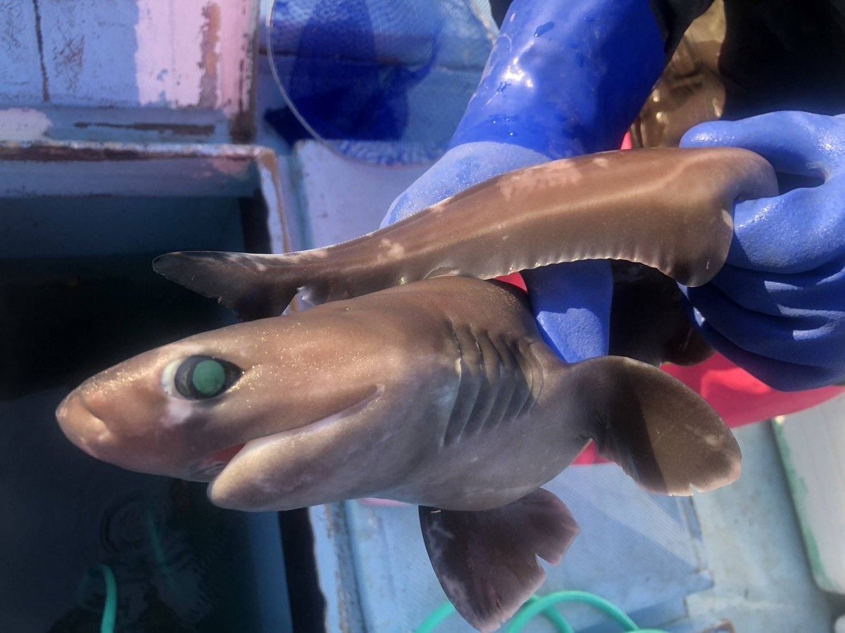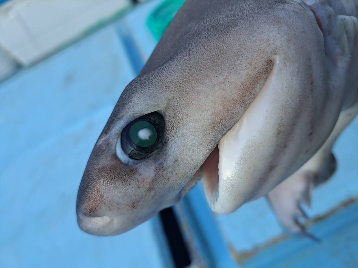 カグラザメ(シロカグラザメかどうかは現在、専門家チームに判定依頼中)。 この個体は識別がかなり難しいらしく、まさかの本気の同定コースに入りました🦈💨 ※結果がわかりしだい、また投稿します! 水深350m前後から上がった個体だそうで、目の色と質感が美しいです✨ #深海魚 #戸田 #滋愛丸応援 pic.x.com/Avk1EYqTxX