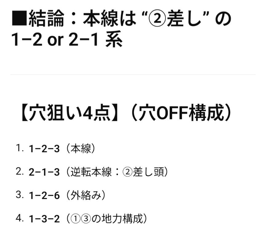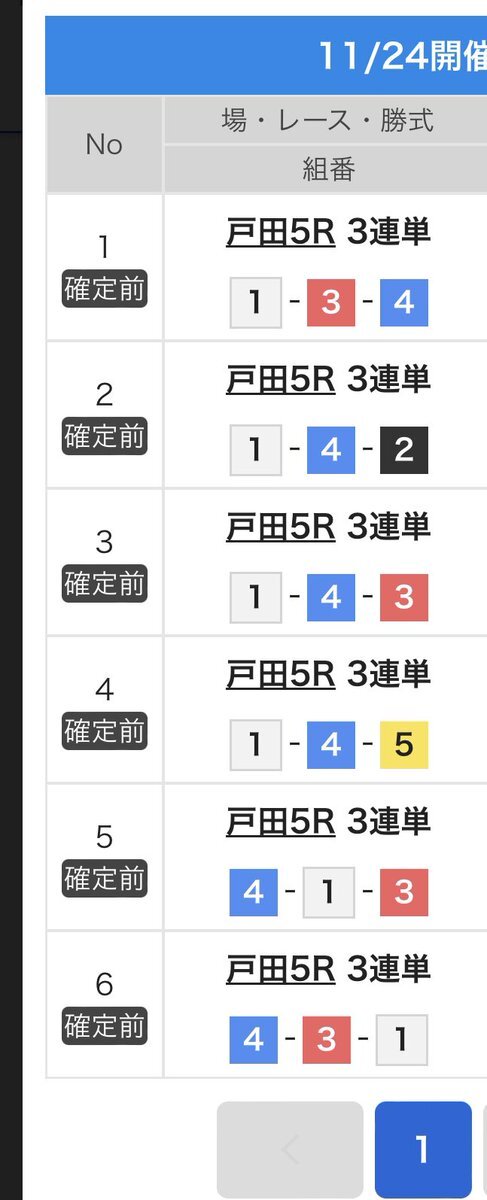 11/24 戸田5R 《印》 ◎1 ◯4 ▲3 △2 ×5 消6 《1着~3着期待度》 高|---1------4--3-25-6-|低 高|-------3412--5----6--|低 高|-------435-2--1-6----|低 《3連単(確率順→)》 134 135 143 145 124 123 125 132 (的中期待度 :37.4%) #競艇 #ボートレース #戸田 #予想