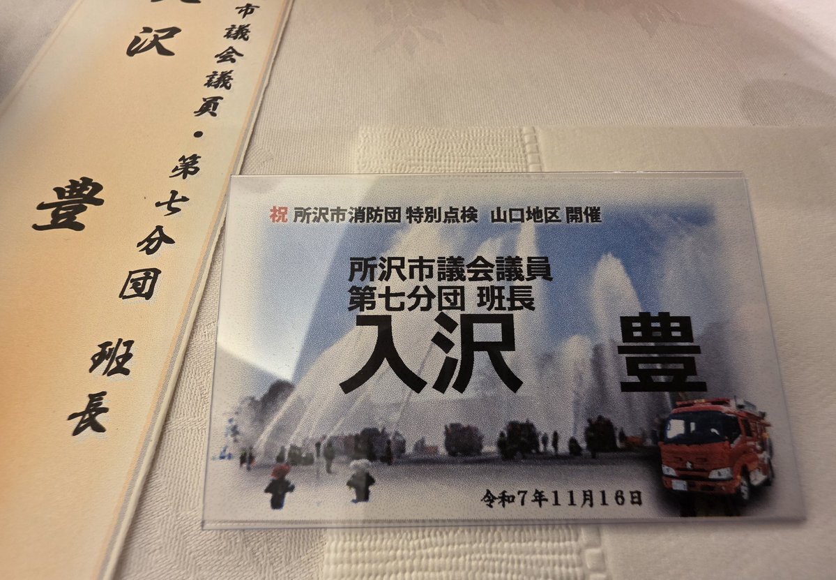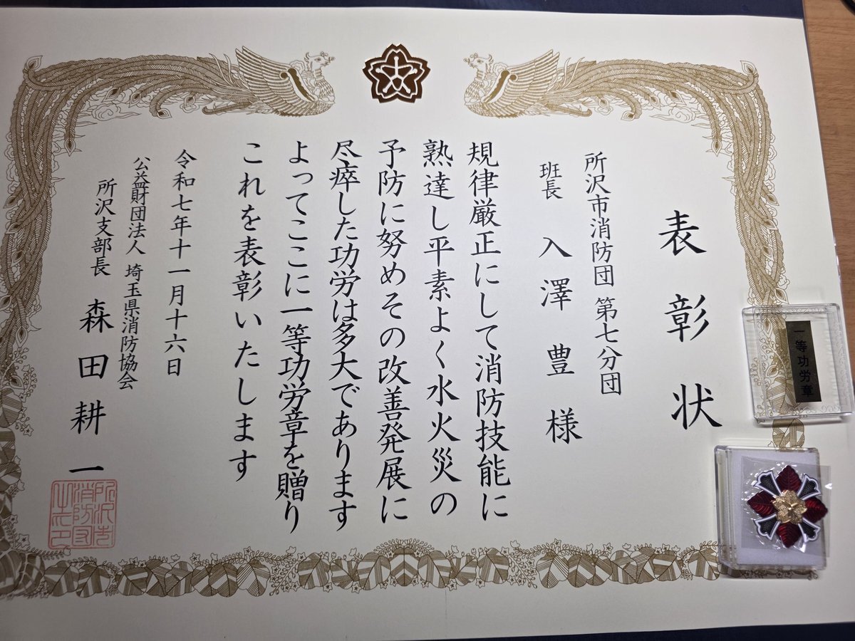 2日連続の #掬水亭 。1等功労賞を頂きました。16、7年の団歴で頂けたのかなと思います。まあ、短いような長いような…。あと、15年の年月を足すと、健康寿命の70歳。今、基礎自治体の議員歴も15年です。これからは、職業人として、最後の人生になります。人生は本当に短い。#所沢 #所沢市議会 #消防団 pic.x.com/dL8gdUmiy5