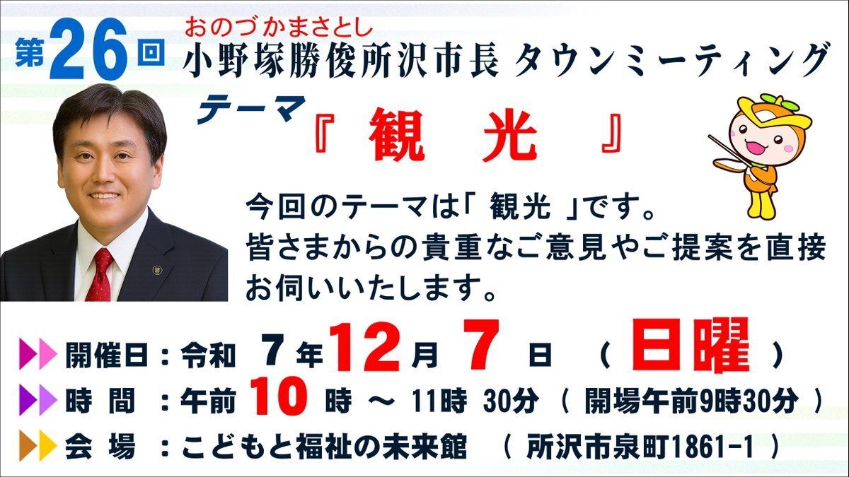 【お知らせ】 ◇通算26回となります"タウンミーティング"を7日に開催! ご意見やご提案を直接お伺いし、市政運営に反映させていく場として、継続的に開催しております。 ◇12月1日(月)~19日(金)まで、第5回(12月)所沢市議会定例会議が開催されます。 #小野塚勝俊 #所沢市長 #所沢市 #所沢市議会 pic.x.com/hPeXWKwLzM