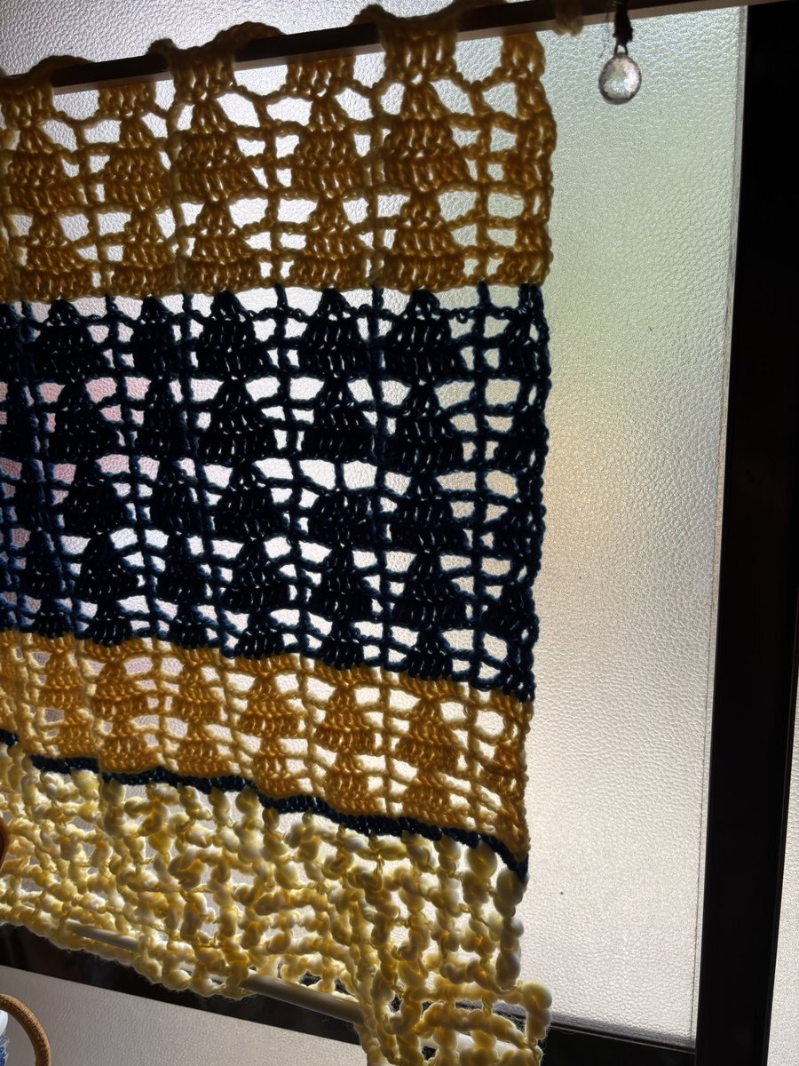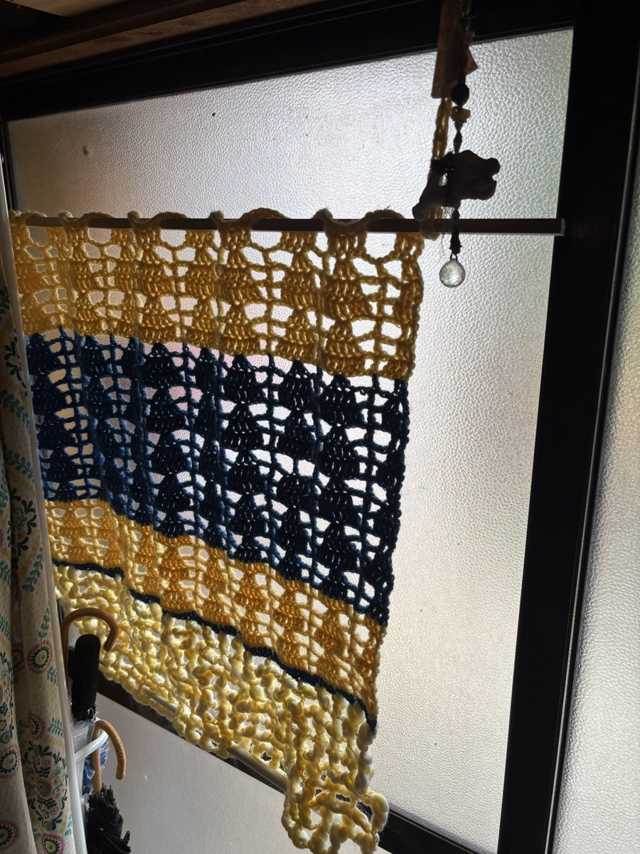 ちまちま #毛糸 #編み物 #かぎ編み #カフェカーテン みたいなもの😅💦 玄関の遮光?と飾りを兼ねてみた☺️ これからの季節にはいいかもね💕︎🎄🎄🎄+モコモコ #瞑想時間 #手仕事 pic.x.com/MsiAqUaKNn