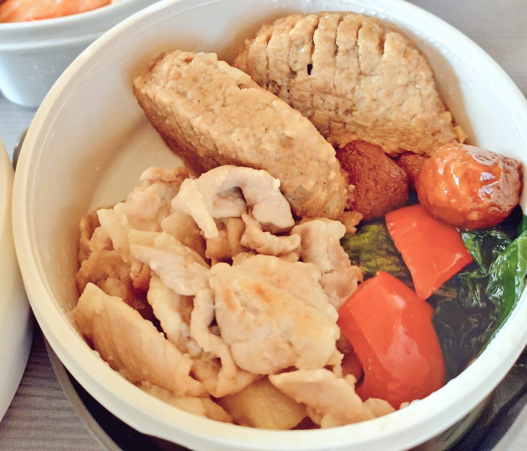 内外食のススメ(火) 今日の献立は、壱ノ段-ハンバーグ、イシイのミートボールトマト味、小松菜お浸し、豚小間生姜焼 弐ノ段-蜆小海老佃煮、数の子山葵漬け、白菜キムチ 参ノ段-トマトサラダにカニかま添えて🍱 #手作り弁当 pic.x.com/tuTAnPD3ct