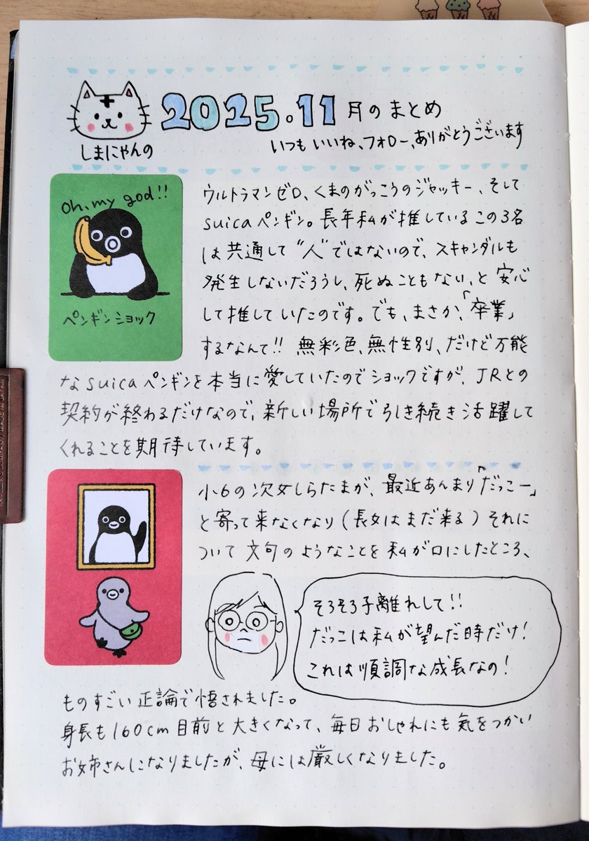 2025年11月のまとめページです いつもいいね、フォロー、 ありがとうございます 先週一週間の腹痛、食欲不振 弱ってるところにインフルエンザ ようやく解熱←イマココ 皆様ご自愛ください。 #しまにゃんエッセイ #手帳ゆる友 pic.x.com/f8z5L9TYdH
