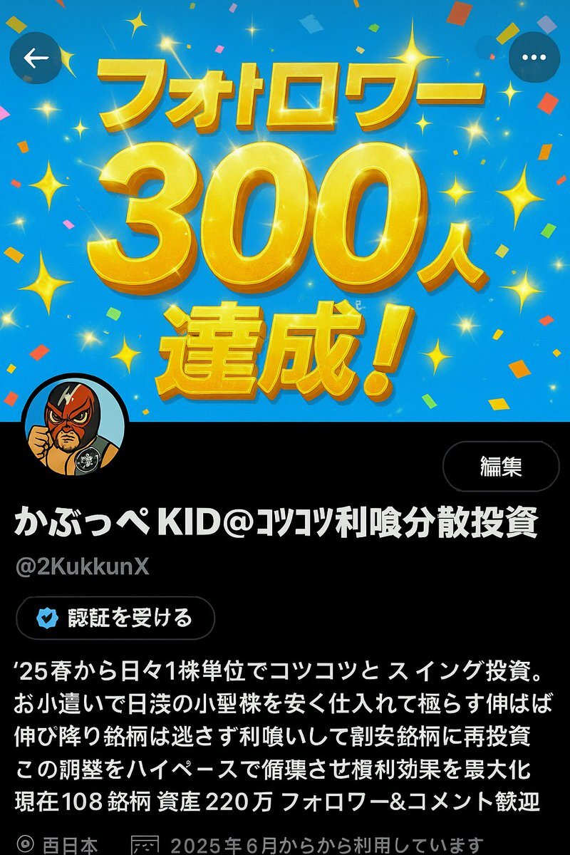 かぶっぺです やったーーーー 本日、フォロワー300人達成しまし🎊 皆様、ありがとうございます😊 6月から始めた投資アカウント、4ヶ月も掛かりました 400人、500人、ブルバ無しで1000人を目指していくぞ! 引き続き、交流の程、宜しくお願いいたします #投資初心者と繋がりたい #投資初心者 pic.x.com/dMxjQAEQi9