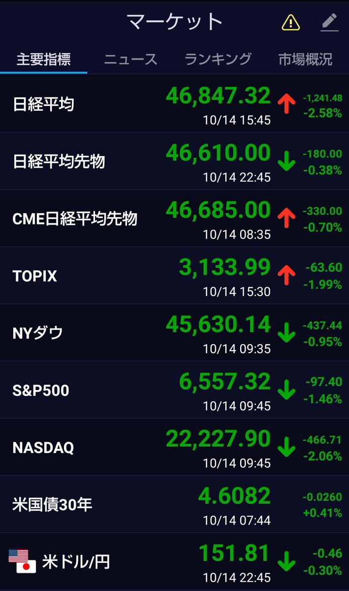 【相場情報】 連休明け10月14日の日経平均は46,847円台まで急落⤵️😱 ⚠️TOPIXも下落⤵️ ⚠️日経平均先物はさらに下落傾向⤵️ ⚠️米国市場も揃って下落⤵️⤵️⤵️ ⚠️米ドル/円は151円台後半で推移🤔 ⚠️警戒感強まる😨 #株友 #株クラ #資産運用 #投資初心者 #投資家さんと繋がりたい #おっきくなぁれ株友の輪 pic.x.com/CzIEZ7bdDd