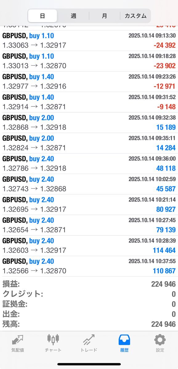 おはようございます😊 昨日も時短ですが爆益でした✨ 🌟10/14オメガアルファ収支報告🌟 8-15時の時短稼働❗️ マイクロ口座対応してます⭕️ 👑GBPUSD/ポンドル +224,946円 プロフURLからEA無料配布中🎁🎁 #自動売買 #投資 pic.x.com/SHsXxxJJbD