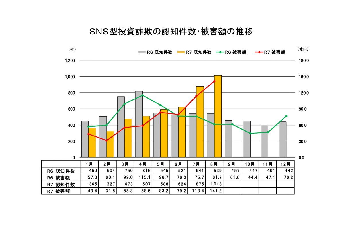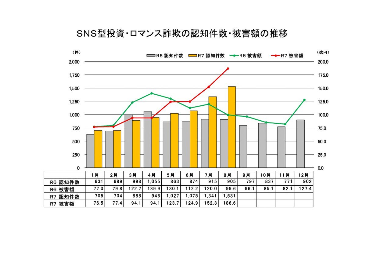 🚨SNS型投資・ロマンス詐欺🚨 令和7年8月の被害状況 認知件数:1,531件 (+626件) 被害額 :186.6億円(+87.0億円) ※()内は前年同月比 昨年より認知件数が1.7倍、被害額が1.9倍に増加 最近の特徴については警察庁HPで確認!! npa.go.jp/bureau/safetyl… #投資 #詐欺 pic.x.com/Stpgr88NWb
