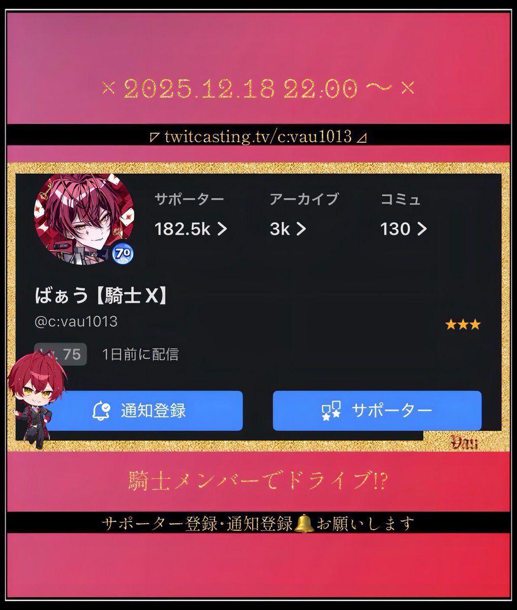 ⤬ #ばぁうくん からお知らせ ⤬ 𝟸𝟶𝟸𝟻.𝟷𝟸.𝟷𝟾 (𝚃𝚑𝚞) 𝟸𝟸:𝟶𝟶 〜 騎士メンバーでドライブ!? ◸ twitcasting.tv/c:vau1013 ◿ 🐰サポーター登録・通知登録お願いします⚔️ #歌い手 #騎士X - #KnightX - #STPR #拡散希望︎ #ツイキャス pic.x.com/7c9NUHsnTj x.com/vau0307/status…