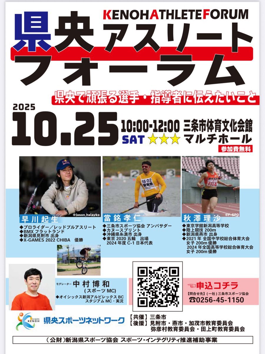 🏅県央アスリートフォーラム開催🏅 10/25(土)10時~たいぶん(三条市) 県央ゆかりのアスリート選手が県央で頑張る選手・指導者に伝えたいことを語ります!ぜひご参加ください😊 #県央アスリートフォーラム #三条市 #スポーツ指導者 #県央スポーツネットワーク