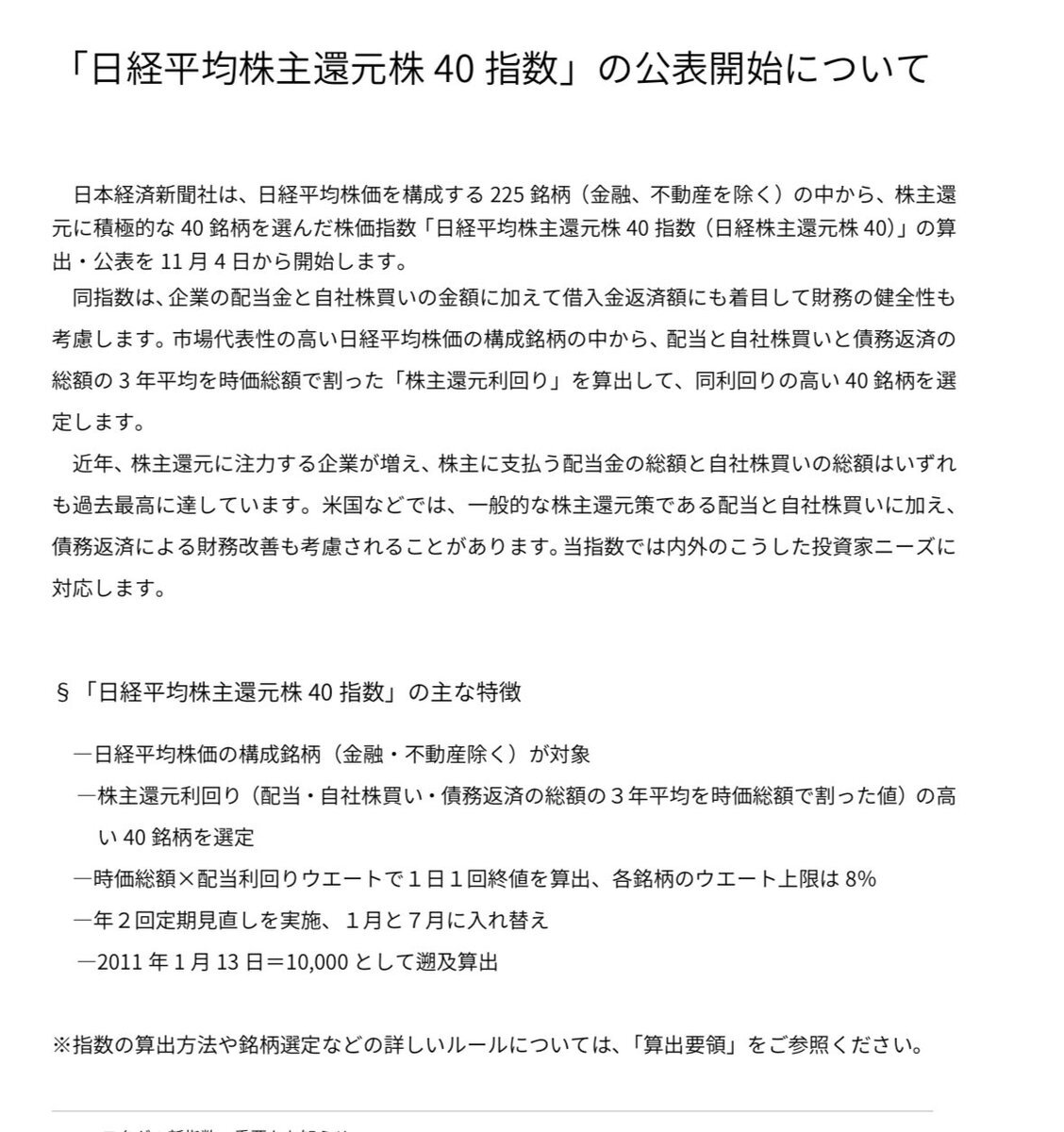 「日経平均株主還元株40指数」が11月4日から算出・公表!!中々興味深く面白い。日経平均225採用銘柄(金融、不動産を除く)の中から、株主還元に積極的な40銘柄が選ばれている!!