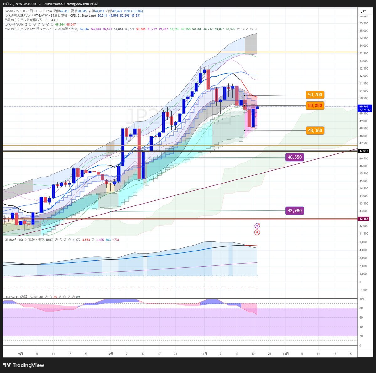 #うえのもんバンド があると #日経平均 が昨日あそこから「反発し易い」という事も視覚的にわかるようになるのだ #仮想通貨 でも #為替 でも、#指数 でも、何にでも使えるのだ~ なお頭上には短期の抵抗要素があるし、オシレータもDCしてるしで、この辺からは逆に上値重 x.com/UwisukiiUeno/s… pic.x.com/uZX0Aws8Os