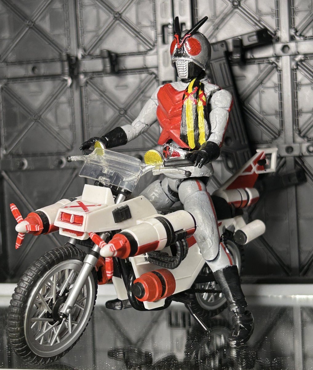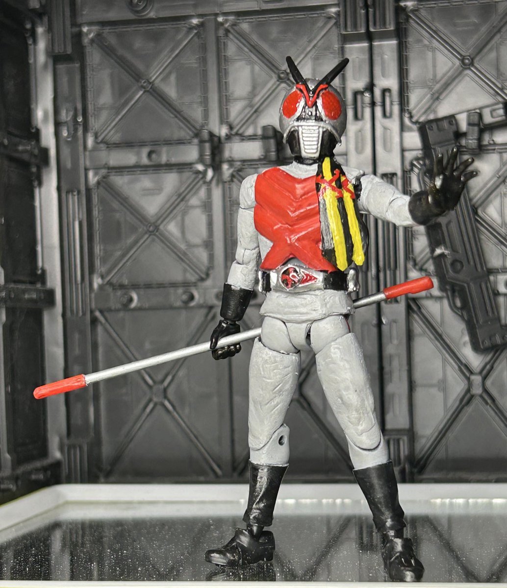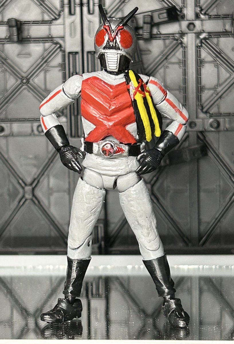 仮面ライダーX完成 1体しか無いのでクルーザー用と単体で飾りたかったから、掌動チャップをベースに創絶の頭部を移植して改造 今年もあと1ヶ月EXCEEDの新情報無いまま年越しそうだな #掌動 #SHODO #仮面ライダーX pic.x.com/kUzfF657EV