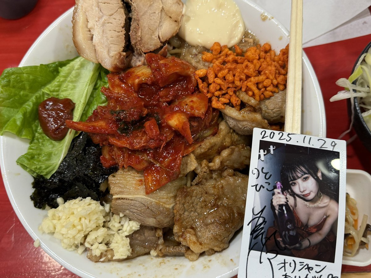 2025.12.21 #ラーメン鷹の目 #ラーメン鷹の目明大前店 #ラーメン二郎 系 #推しメン #唐仁原伶 添えて 【限定】キムカルまぜそば ナムル、豚追加 全まし とても美味しい1杯でした!ビビンバみたいな味付けに、鷹の目秘伝のカエシ、脂の相性抜群でした😊 仕事終わりの疲れてる体に元気出ました⭐️ pic.x.com/wIDm9LYKG1