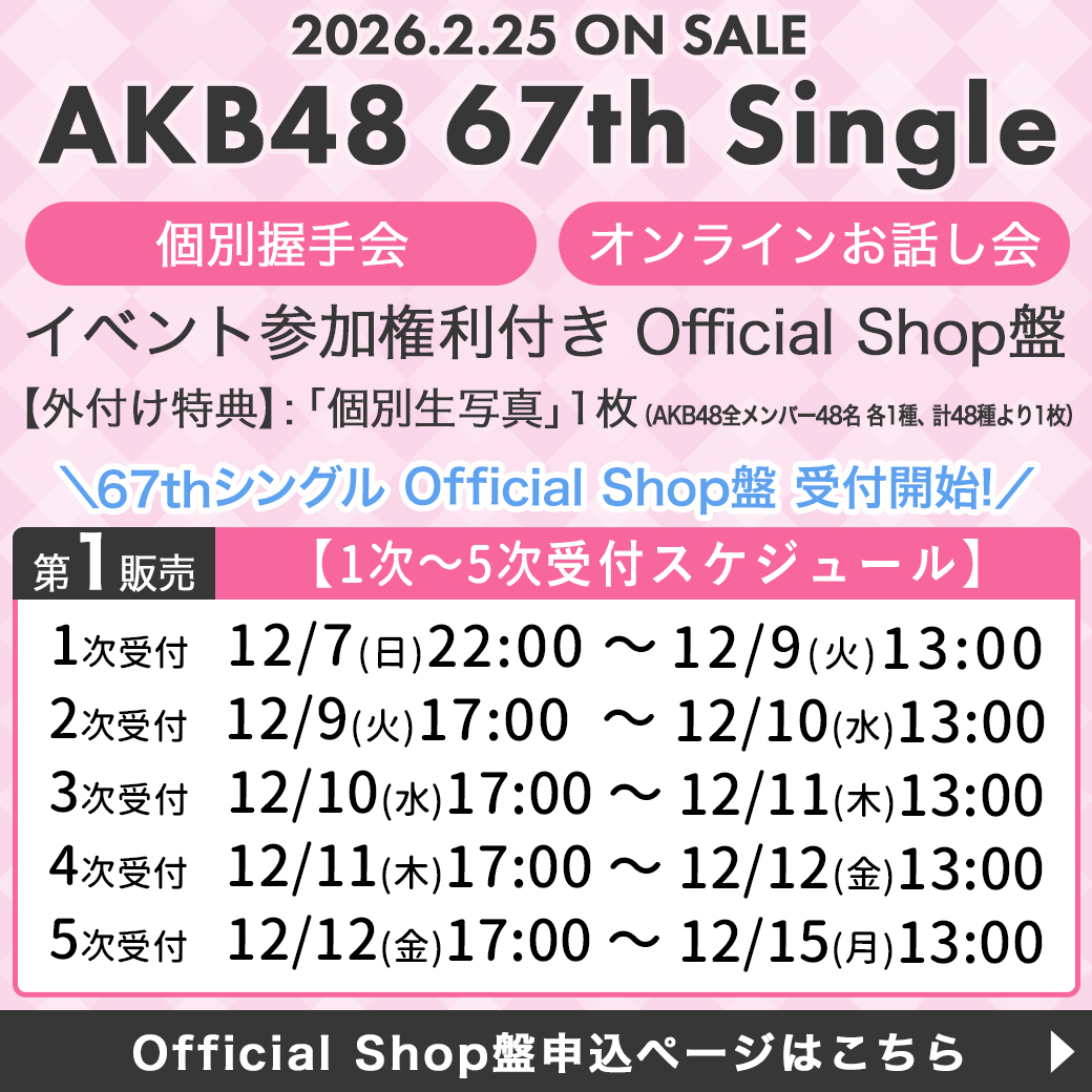 #AKB48_67thSingle 2026/2/25 Release❄️ イベント参加権利付き🎟️ Official Shop盤💿 はじめての方も😳お久しぶりの方も😊 #推しメン に会いに来てください💗 📝おまとめ決済は12/15(月)19:00から🏃🏻 お申込みはこちらから👇🏻 official-cd.akb48.co.jp/akb48-67th/ #AKB48 #AKB48OfficialShop pic.x.com/arlcu7fgG4