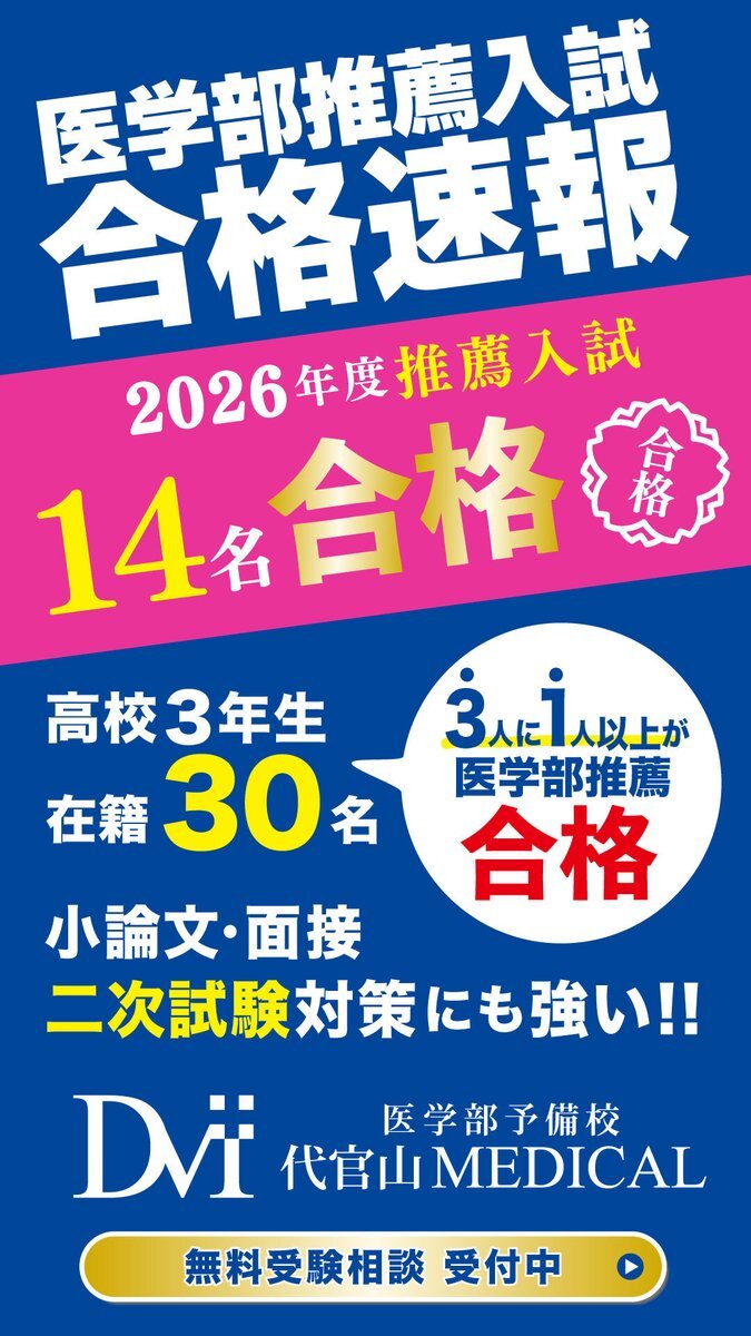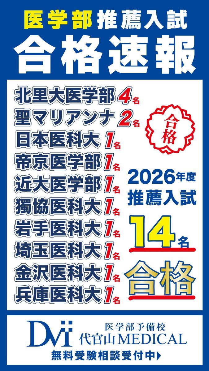 【🎉2026年度 医学部推薦入試 合格速報📷】 📷 現役生30名在籍 → 3人に1人以上が推薦合格! 「現役で医学部」は、戦略で決まる。 現役で医学部合格を目指すなら 代官山MEDICAL。 お問い合わせはコチラ ‼️ daikanyama1999.com/contact/ #医学部受験 #推薦 #現役医学部 #代官山MEDICAL pic.x.com/Fjj0DwMzWe