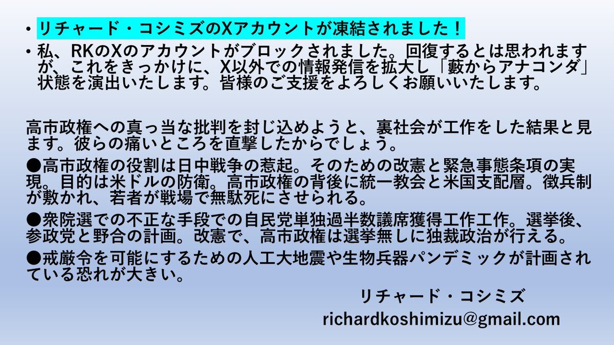 RK先生のXアカウント凍結が解除されました。😊 情報発信再開です。 #リチャード・コシミズ #高市早苗 #統一教会 #改憲 #緊急事態条項 #日中戦争 #ディープステート shin-sourai.jugem.jp/?eid=20