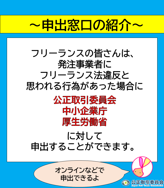 【フリーランス法違反かも?と思ったらここに連絡】 フリーランスの皆さん! 発注事業者から報酬を減らされた、口頭で発注されたなど フリーランス法違反と思われる行為を受けていませんか? 今週の車内ビジョンは「申出窓口」です。 申出窓口🔽 jftc.go.jp/soudan/shinkok… #公正取引委員会 #政府広報 pic.x.com/m4VleqyKal x.com/jftc/status/19…