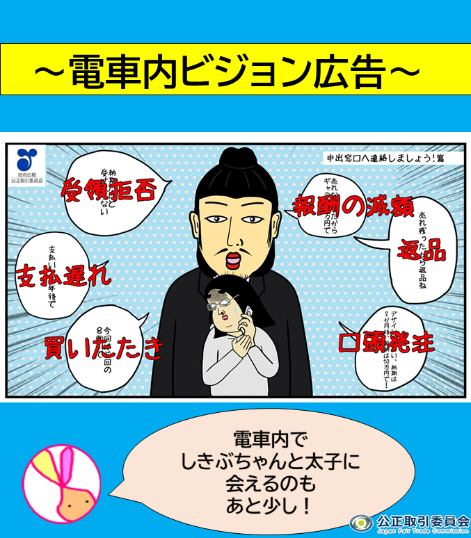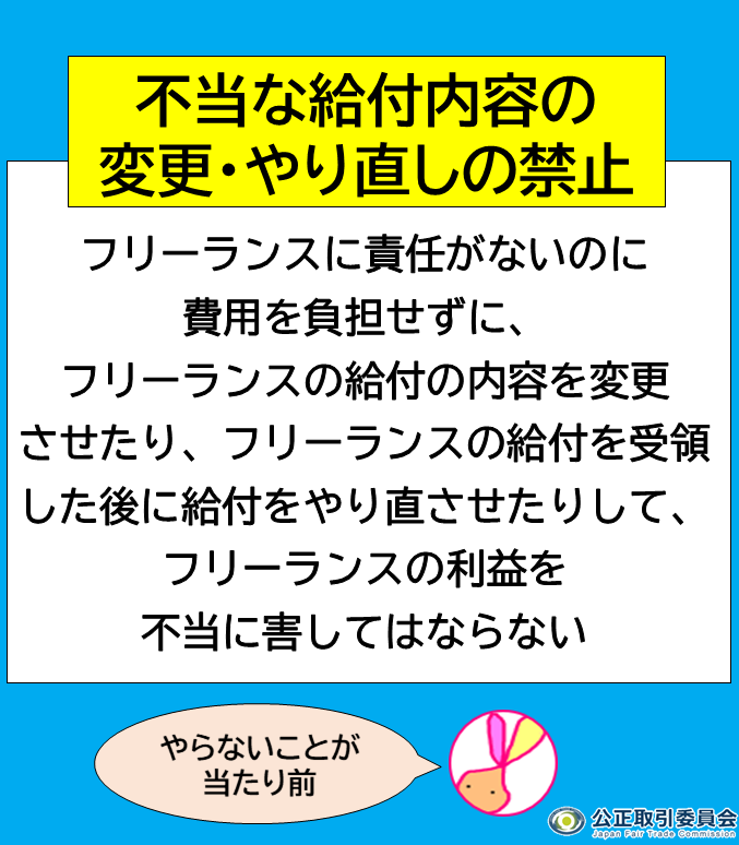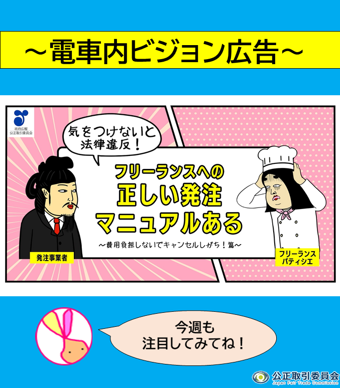 【気をつけないと法律違反かも!?】 今週、車内ビジョンで流れているフリーランス法動画の内容は「不当な給付内容の変更・やり直しの禁止」。 費用負担なしの発注内容の変更/やり直し/取消しは、フリーランス法違反のおそれがあります。 特設サイト🔽 jftc.go.jp/freelancelaw_2… #公取委 #政府広報 pic.x.com/C9uJIyAuVv x.com/jftc/status/19…