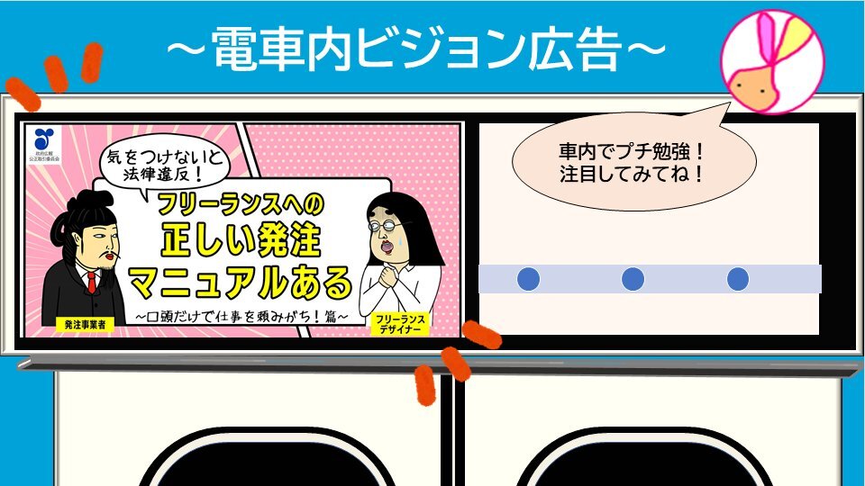【気をつけないと法律違反かも!?】 今週、車内ビジョンで流れているフリーランス法動画の内容は「不当な給付内容の変更・やり直しの禁止」。 費用負担なしの発注内容の変更/やり直し/取消しは、フリーランス法違反のおそれがあります。 特設サイト🔽 jftc.go.jp/freelancelaw_2… #公取委 #政府広報 x.com/jftc/status/19…