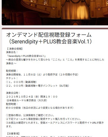 「Serendipity +PLUS #教会音楽 Vol.1」演奏会 #オンデマンド配信 が始まりました!S券、オンデマンド配信のチケットをお持ちのお客様はログインいただきお楽しみください🎥配信チケットのご購入はこちらからどうぞ!➡forms.gle/pTyXd8XVPADsak… #MusicOfficeSonus #川上徹 #加藤麻衣子 #鈴木花安 pic.x.com/WYWRTJsbKn