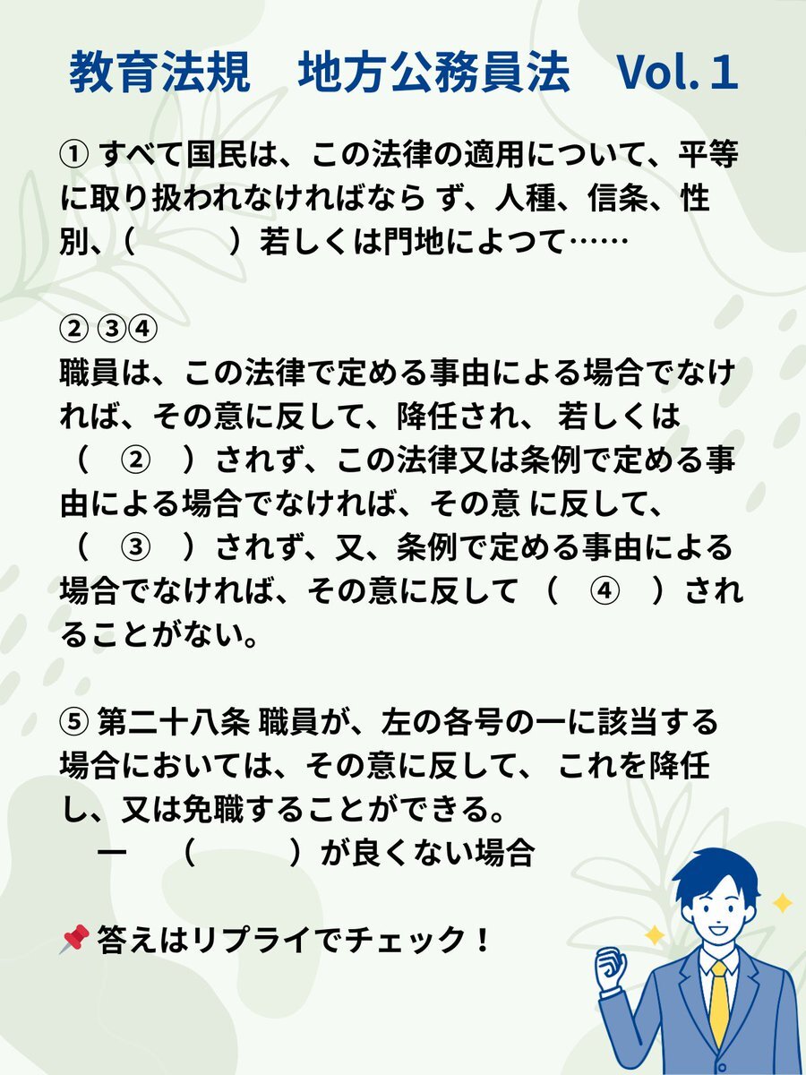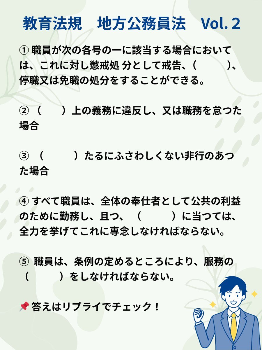 【教育法規】 問題を解いて自信を! クイズと解答を画像でチェック。今すぐ対策を始めよう! #教員採用試験 #教採 #教育法規 #教育基本法 #学校教育法 pic.x.com/yorW0KVHbd