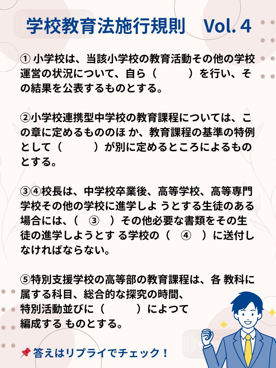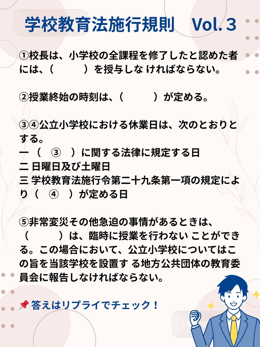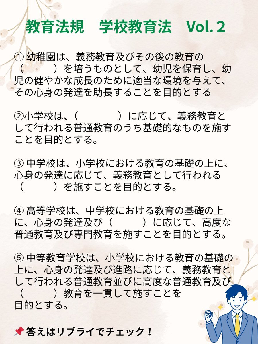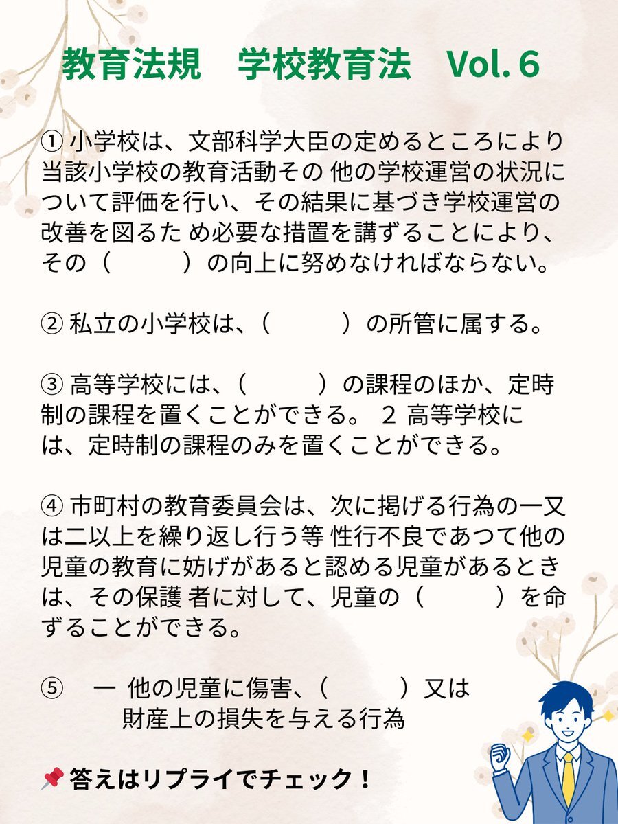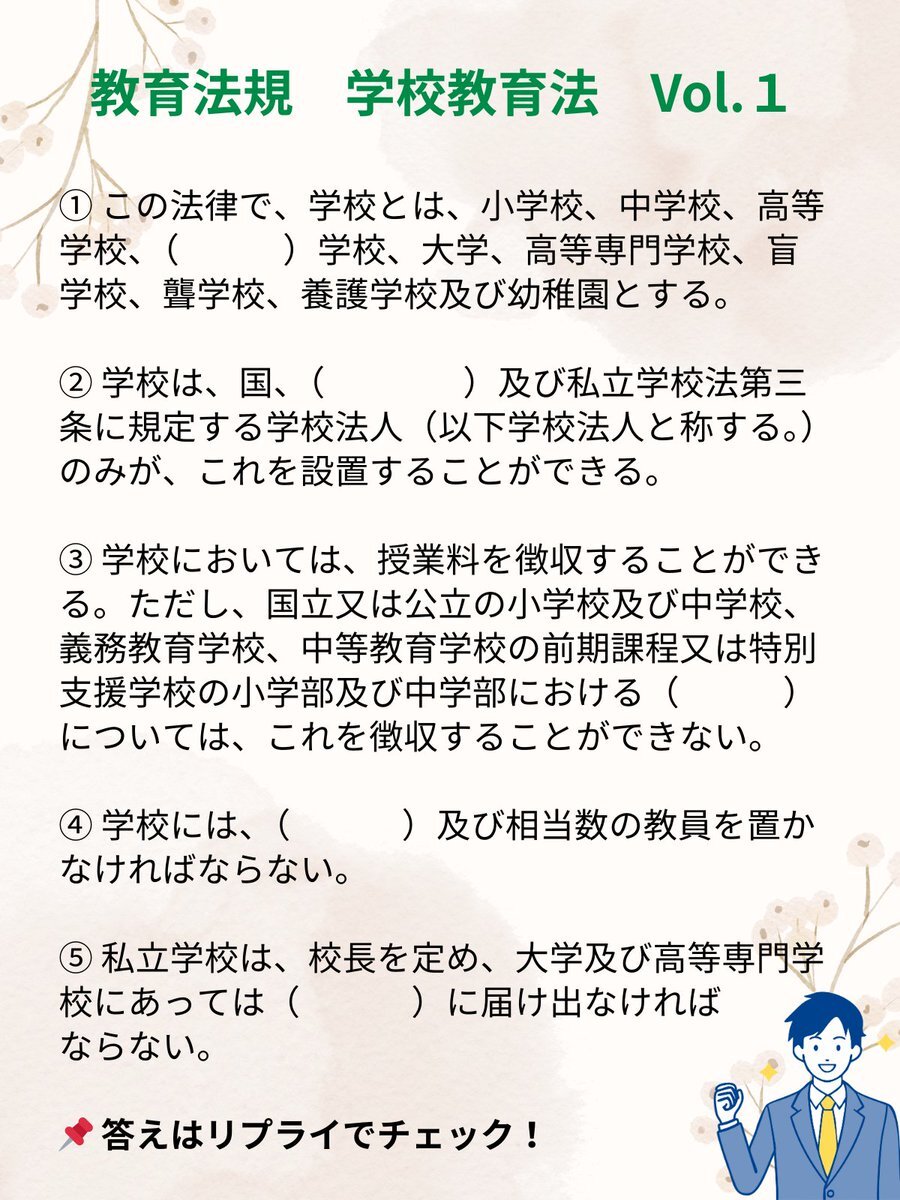 【教育法規】 問題を解いて自信を! クイズと解答を画像でチェック。今すぐ対策を始めよう! #教員採用試験 #教採 #教育法規 #教育基本法 #学校教育法 pic.x.com/c91rlnhuOt