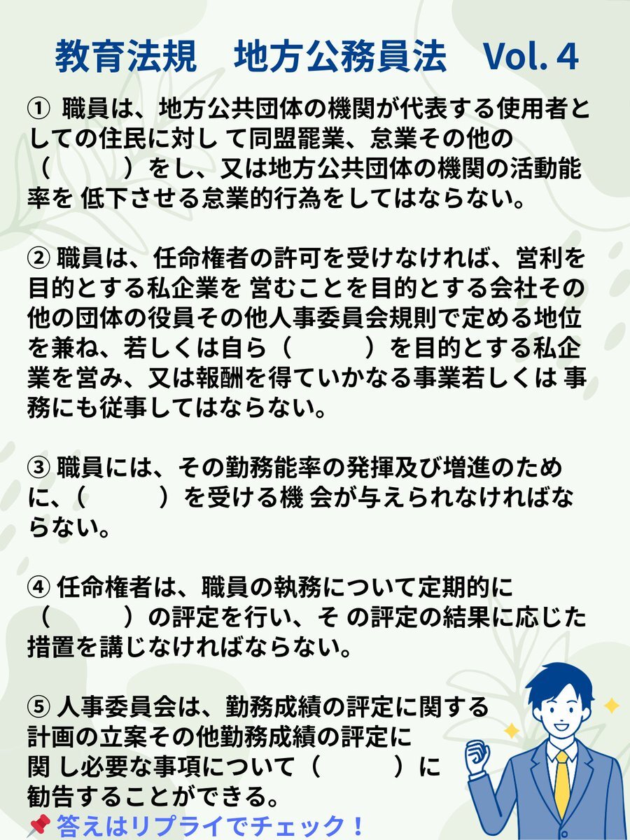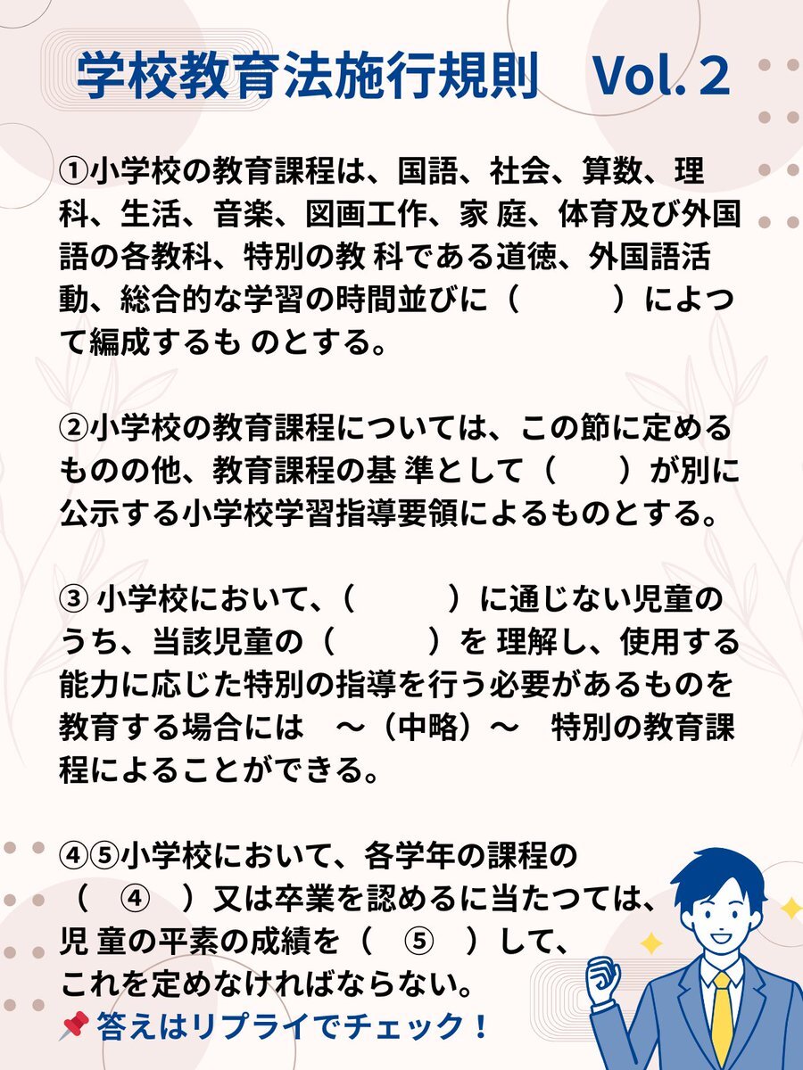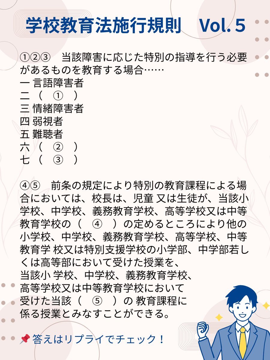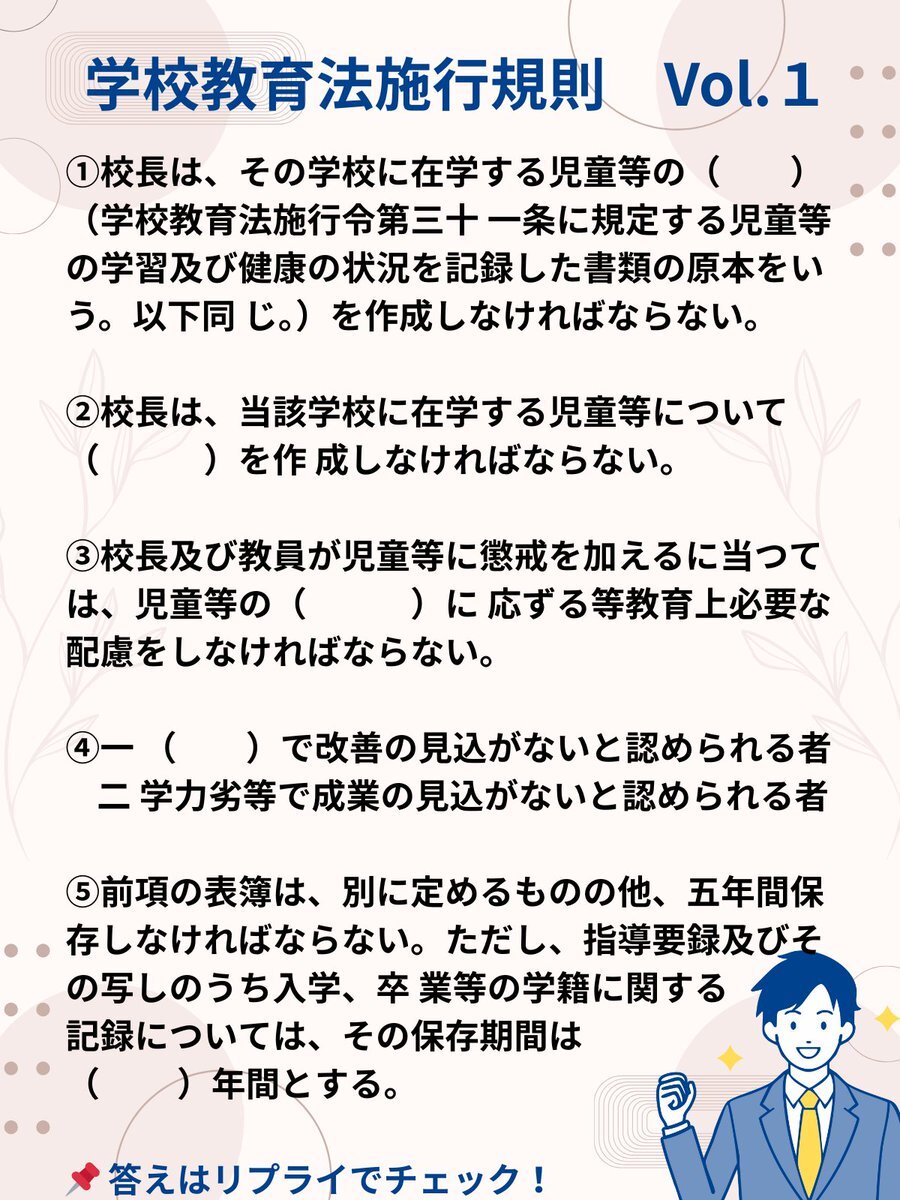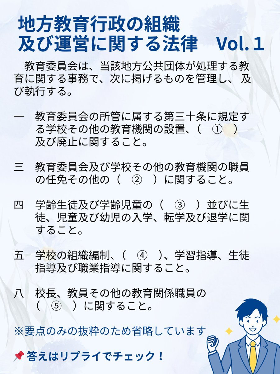 【教育法規】 問題を解いて自信を! クイズと解答を画像でチェック。今すぐ対策を始めよう! #教員採用試験 #教採 #教育法規 #教育基本法 #学校教育法 pic.x.com/c91rlnhuOt