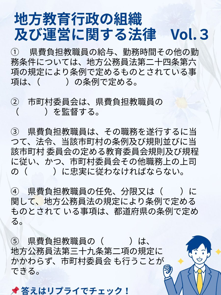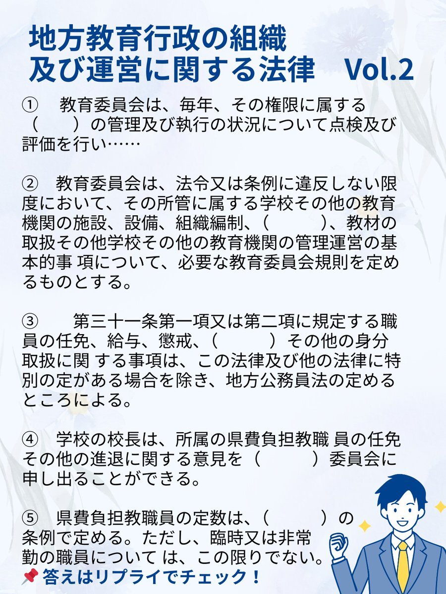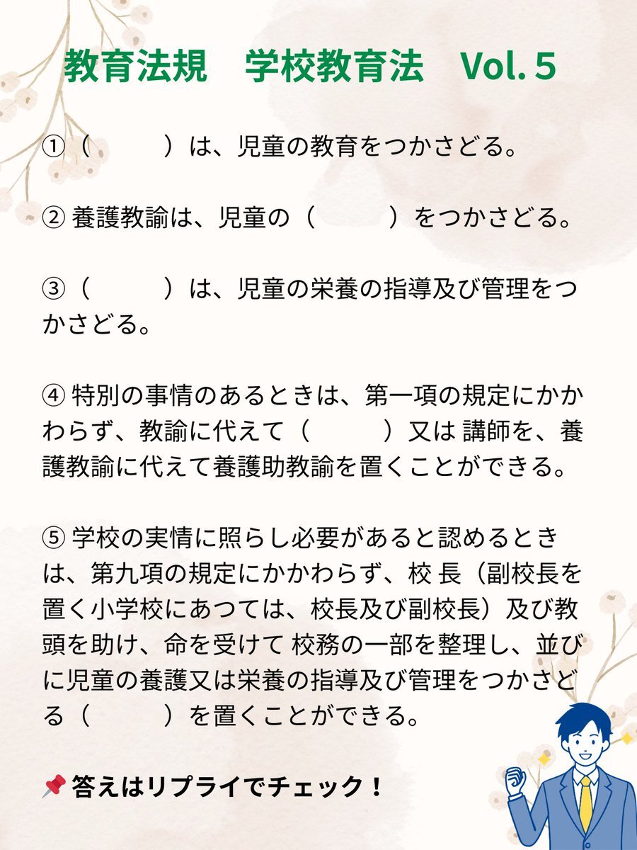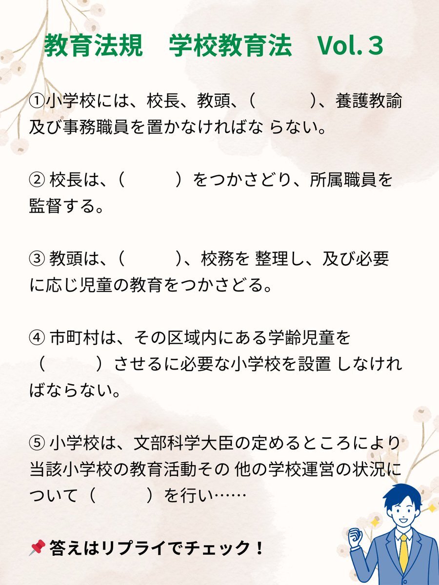 【教育法規】 問題を解いて自信を! クイズと解答を画像でチェック。今すぐ対策を始めよう! #教員採用試験 #教採 #教育法規 #教育基本法 #学校教育法 pic.x.com/99RtFG3XxZ