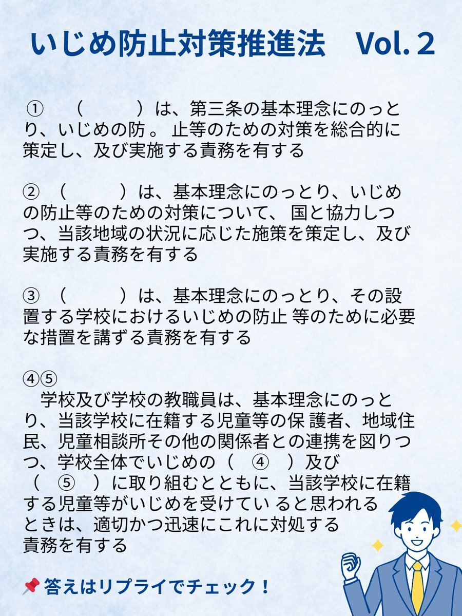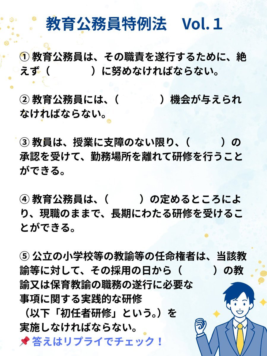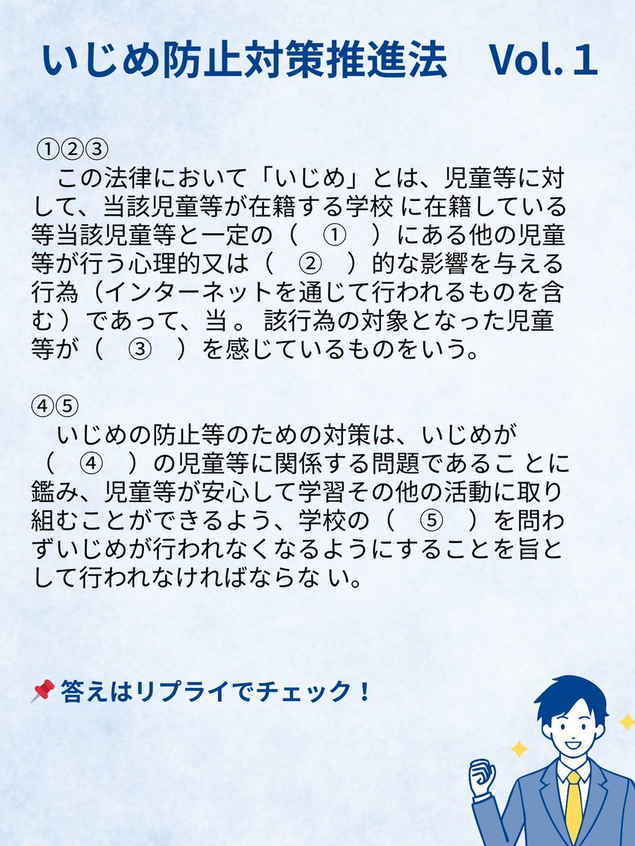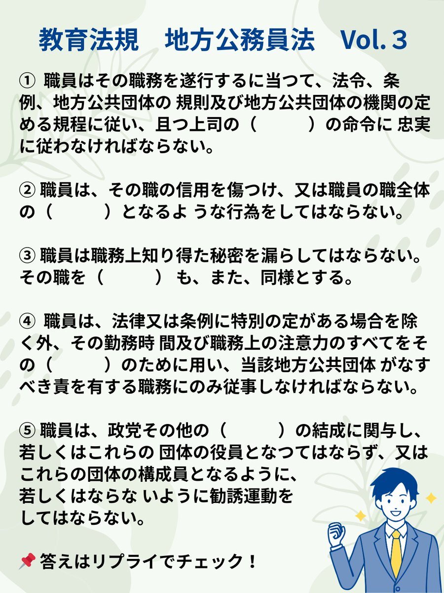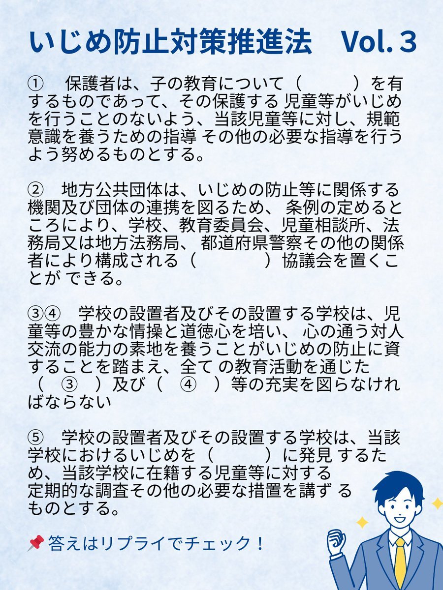 【教育法規】 問題を解いて自信を! クイズと解答を画像でチェック。今すぐ対策を始めよう! #教員採用試験 #教採 #教育法規 #教育基本法 #学校教育法 pic.x.com/99RtFG3XxZ