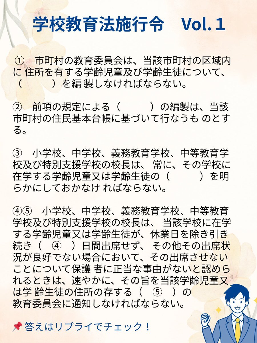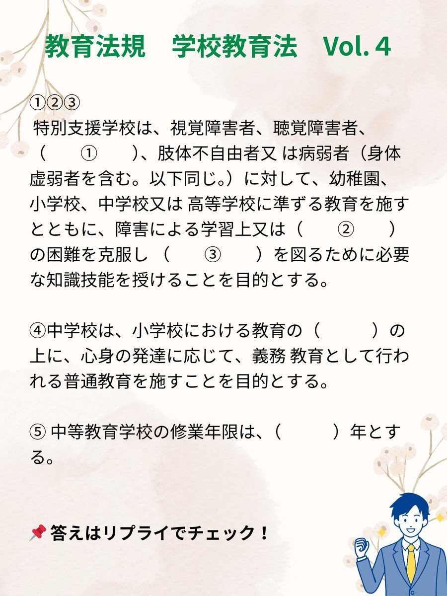 【教育法規】 問題を解いて自信を! クイズと解答を画像でチェック。今すぐ対策を始めよう! #教員採用試験 #教採 #教育法規 #教育基本法 #学校教育法 pic.x.com/8QlqWpThZ6