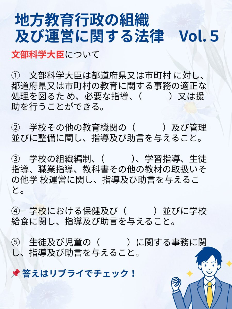 【教育法規】 問題を解いて自信を! クイズと解答を画像でチェック。今すぐ対策を始めよう! #教員採用試験 #教採 #教育法規 #教育基本法 #学校教育法 pic.x.com/PLdkOXJI9s