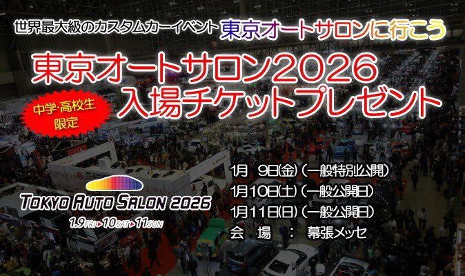 東京オートサロン2026入場チケットが当たる‼️😍(中学生、高校生限定です🥹) 本校からもカスタムカーを出展します‼️ 応援よろしくお願いいたします😉 応募&詳細は、こちらから↓ saijidai.ac.jp/news/saijidai-… #埼自大 #さいじだい #saijidai # #くるま #整備士 #東京オートサロン #tas2026 pic.x.com/VMKEiZ2ArN