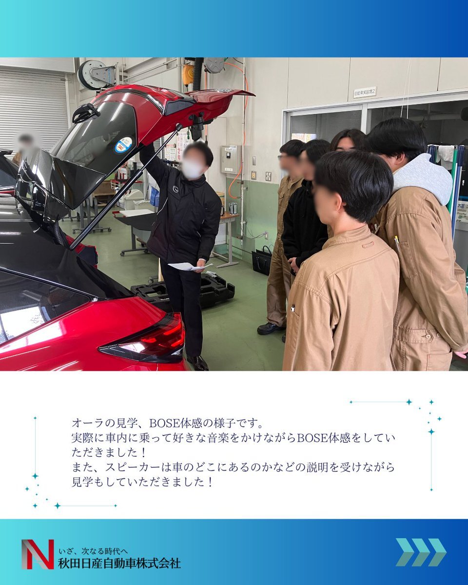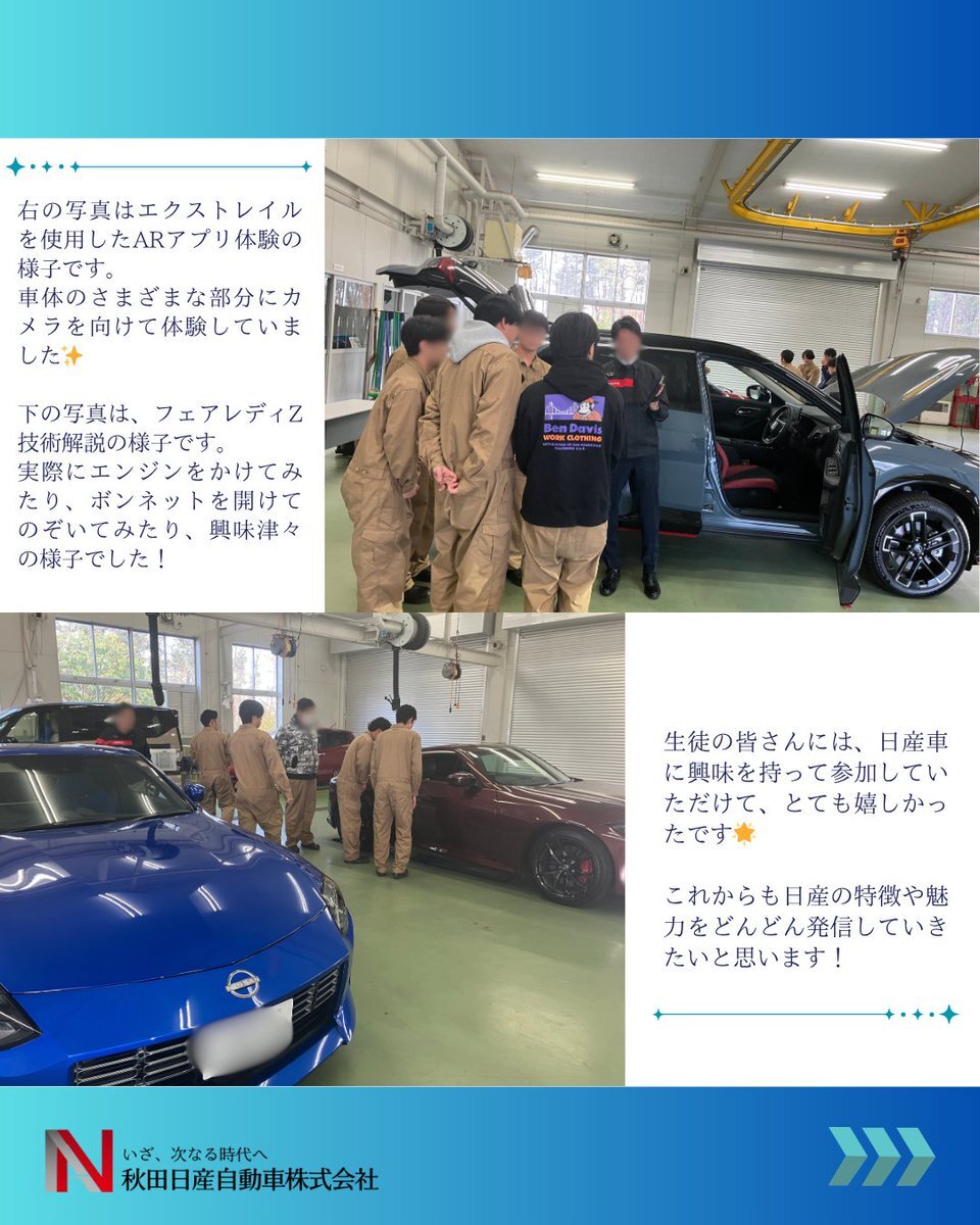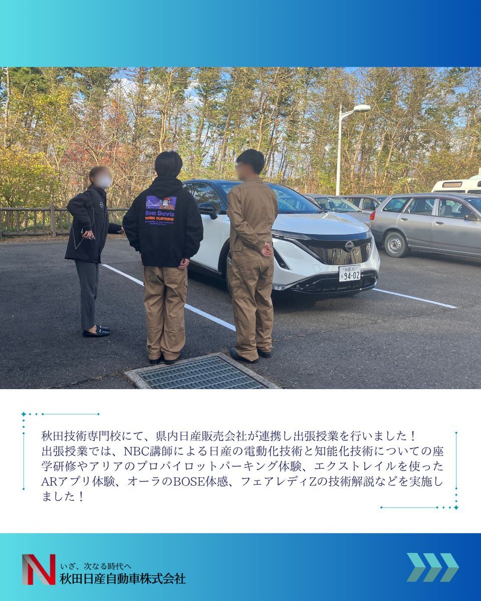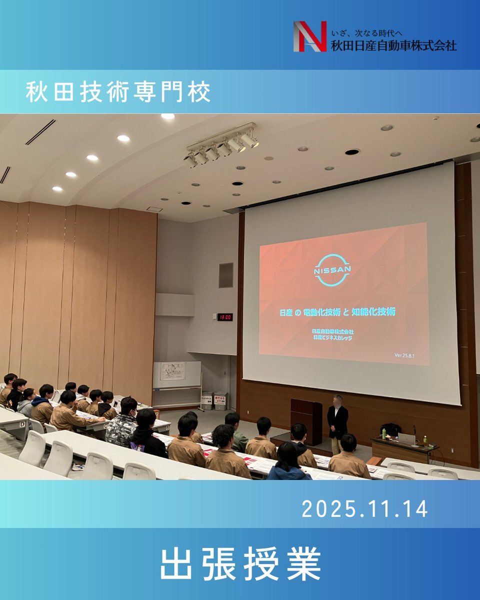 こんにちは!秋田日産採用担当です🌈 11月14日(金)秋田技術専門校にて 出張授業を実施しました!! 生徒の皆さんに日産の魅力が伝わっていたら とても嬉しいです!! #秋田 #日産 #27卒 #出張授業 #就活生と繋がりたい #新卒 #整備士 pic.x.com/9jxq0X5KNB