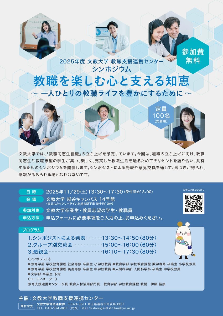 【教育・研究】教職支援連携センター シンポジウム「教職を楽しむ心と支える知恵 〜一人ひとりの教職ライフを豊かにするために〜」を開催します 開催日時:11月29日(土)13:30~17:30 (受付13:00) 記事はこちら↓ bunkyo.ac.jp/news/archive/2… #文教大学 #越谷キャンパス pic.x.com/YFCS8g08Z0