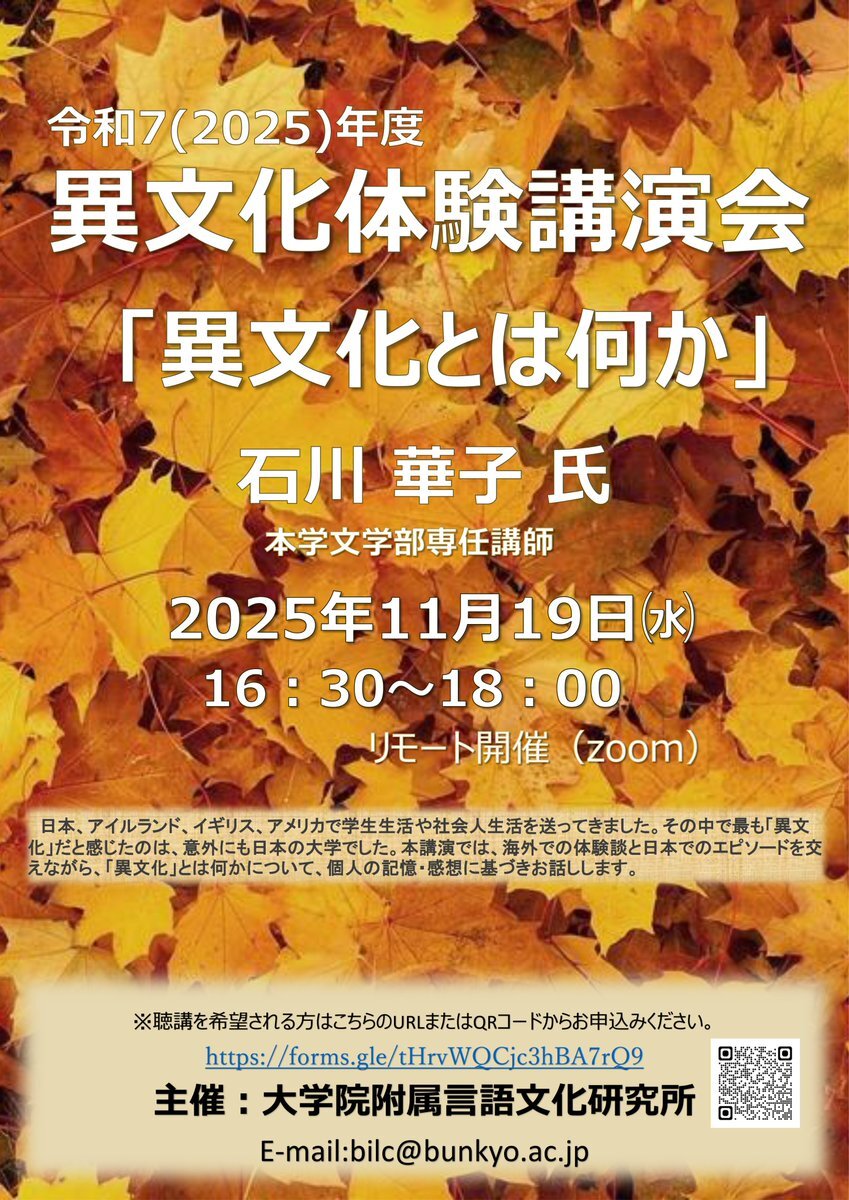 【教育・研究】令和7年度 言語文化研究所 異文化体験講演会「異文化とは何か」開催のお知らせ 開催日時:2025年11月19日 16:30~18:00 記事はこちら↓ bunkyo.ac.jp/news/archive/2… #文教大学 #越谷キャンパス pic.x.com/Eo0iiGmfb2
