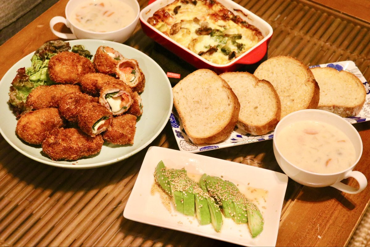 トマト、大葉、モッツァレラチーズのカツ アボカド刺し マッシュルーム、ブロッコリー、ベーコンのオープンオムレツ クラムチャウダー バゲット #料理好きな人と繋がりたい #料理写真 #お腹ペコリン部 #X家庭料理部 #自炊記録 pic.x.com/5BvNs2xoCK