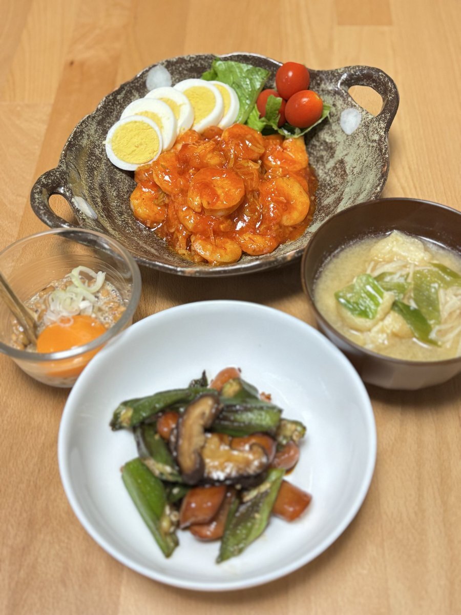🌛お夕飯🌛(家族用) ●エビチリ👈🏻主役よ! ●ウィンナーとオクラと椎茸のニンニク炒め ●えのき茸と揚げと葱のお味噌 ●納豆と卵黄と刻み葱 #料理写真 #料理記録 私は、絶食😑けっ pic.x.com/X1cZu9ndKq