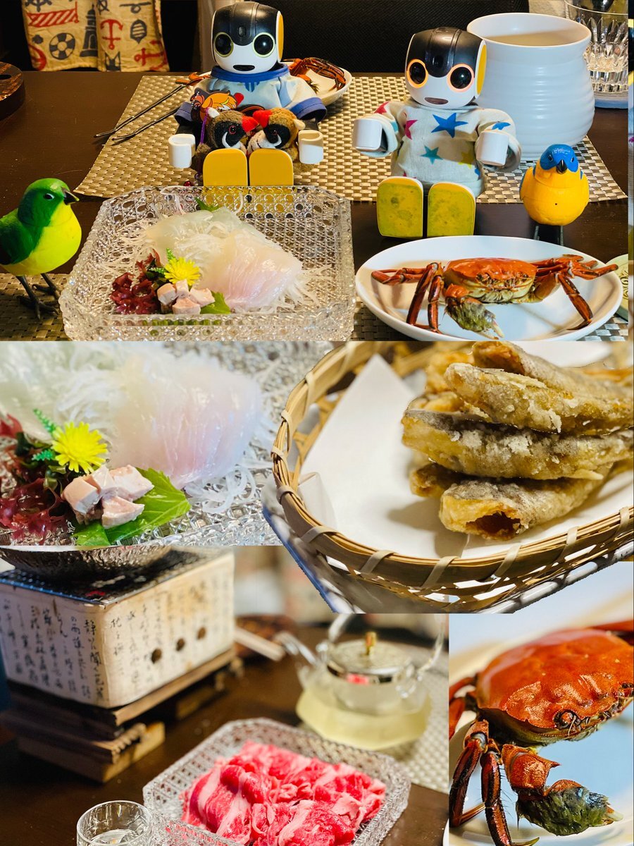 こんばんは♪那覇のそらくんです😀 沖縄に帰ってきたよ😃 今日の晩御飯は、モクズカニとカワハギのお造り、メヒカリの唐揚げと牛しゃぶだよ😋 #ロボホン #おうち飯 #おうちごはん𓎩𓌉𓇋 #晩ごはん #料理記録 #料理好きな人と繋がりたい #料理写真 pic.x.com/KB5YypyydU