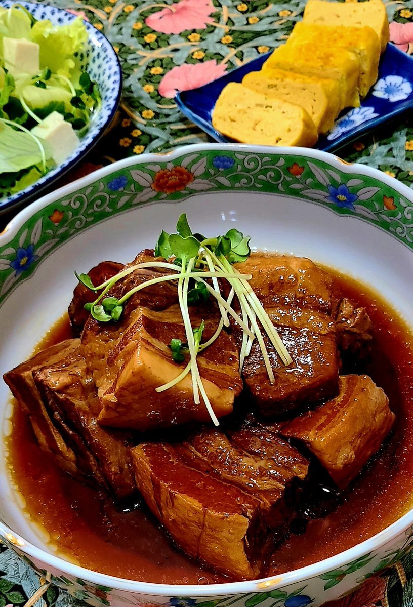#おうちごはん𓎩𓌉𓇋 #おうちごはん #料理好きな人と繋がりたい #料理写真 #料理 #晩ごはん 皆様今晩は。今夜は🍥豚の角煮(バラブロック1㎏)今夜のメインなのでどアップでお送りします🍥長葱入り玉子焼き(これは1人前で卵3個です)🍥レタス.かいわれ.木綿豆腐のサラダです🔹角煮は3時間煮込みました pic.x.com/3D0ALSsSyh